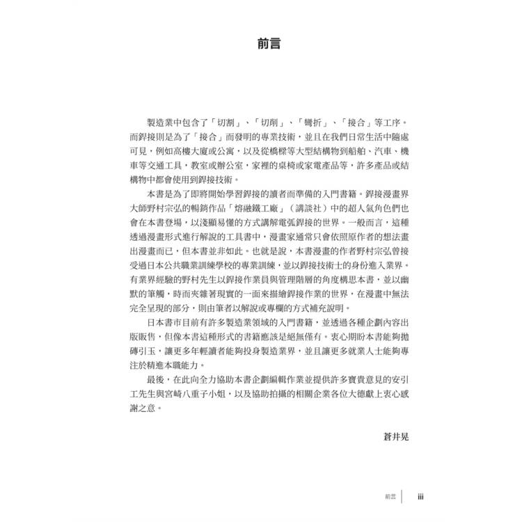 日本書市目前有許多製造業領域的入門書籍,並透過各種企劃內容出版販售,但像本書這種形式的書籍應該是絕無僅有的。衷心期盼本書能夠拋磚引玉,讓更多年輕讀者能夠投身製造業界,並且讓更多就業人士能夠專注於精進本職能力。