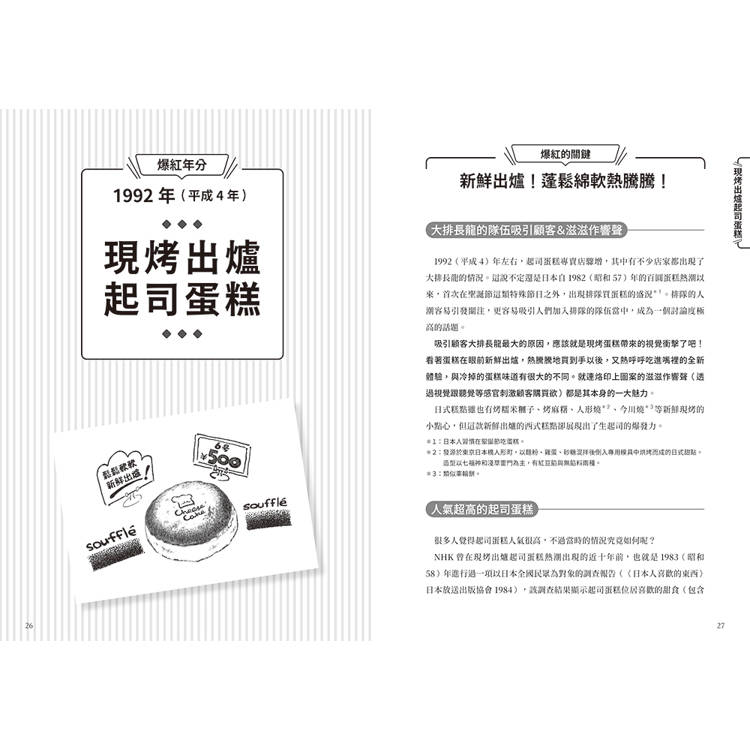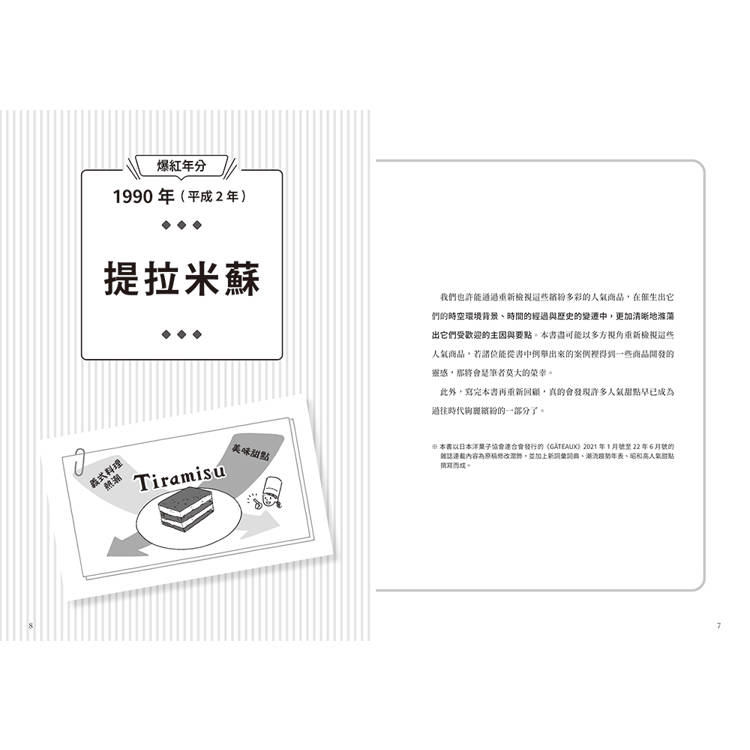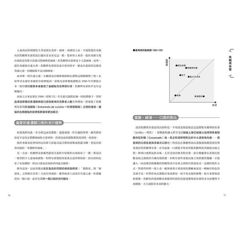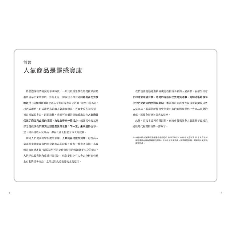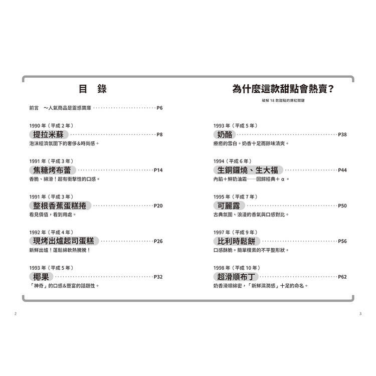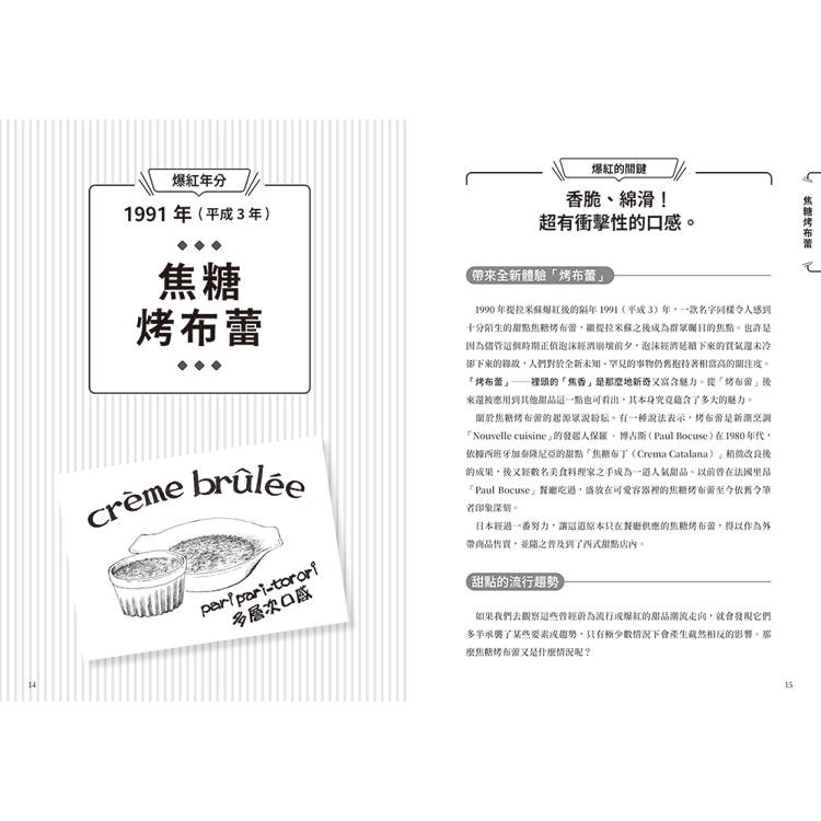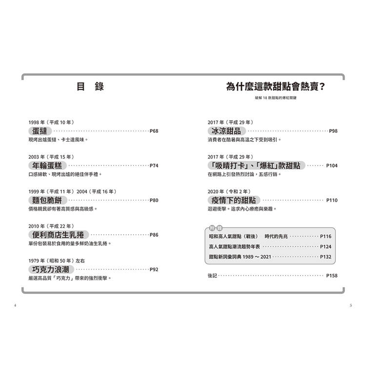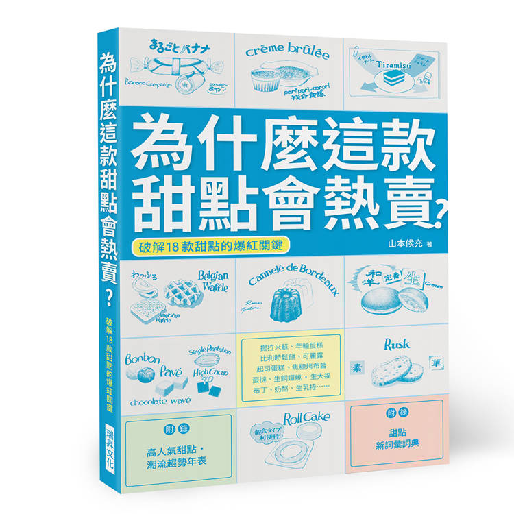 本書回顧18款人氣甜點的流行軌跡。作者山本候充以貼近日常的視角,從「人們什麼時候、為什麼想吃」出發,結合商品企劃與市場觀察,解析甜點如何在生活需求、口感設計、命名策略與販售通路的交會下,成為現象級商品。