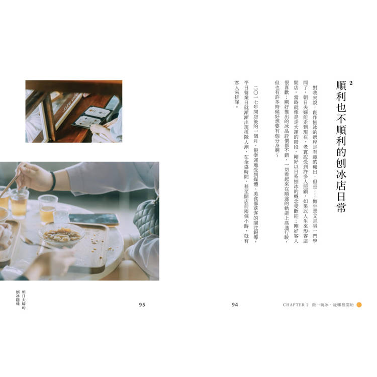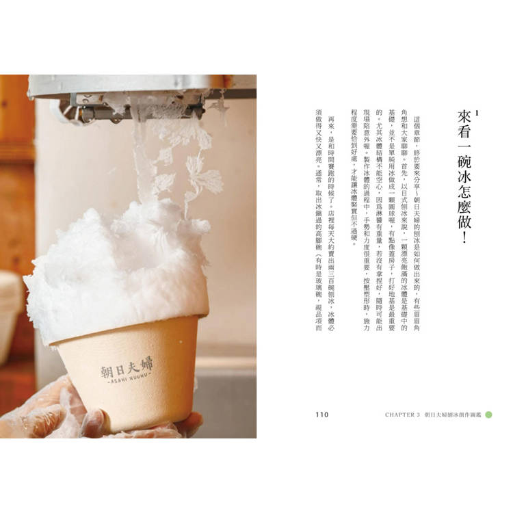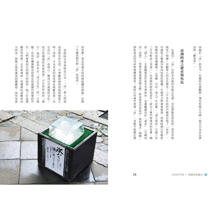 除了吃冰,書中還收錄了淡江大學大眾傳播學系助理教授──精采分享的冰之歷史,一樣不可錯過。臺灣、日本分別是從什麼時候始出現「冰」的?吃冰原本是貴族才有的高級娛樂?日式刨冰是如何走向世界、掀起現象級風潮的?除了梳理飲食歷史及文化脈絡之外,還要帶讀者走一遭在奈良知名的「冰室白雪祭」!