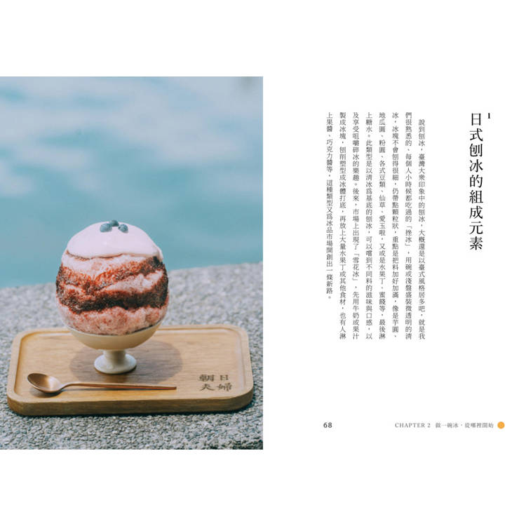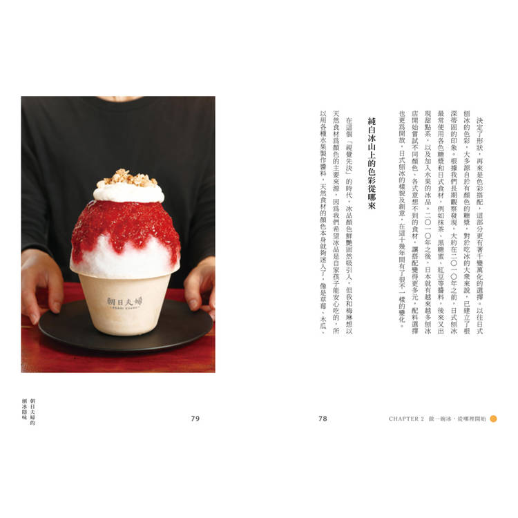 最後,看看日式刨冰的多變魅力,用不同形式體驗品嚐的樂趣,它可以是外帶便當,或是料滿滿的獨享杯,更是讓大人小孩開心交流的活動主題!趕快翻開本書,舀一口刨冰裡的有趣學問吧,每一頁都讓你暑氣全消!
