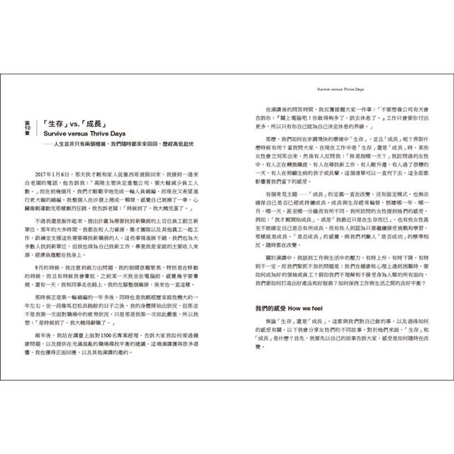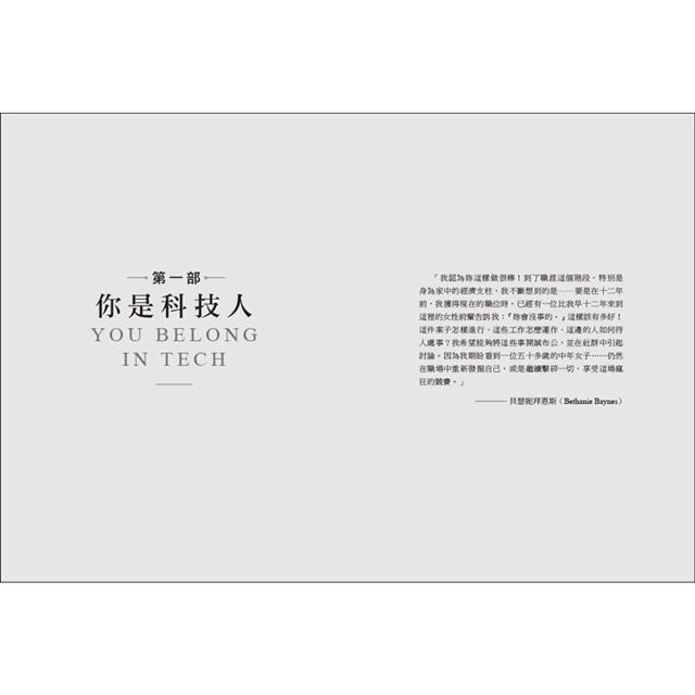 第三部則更為務實,我分享了可以用來發展事業和解決困境的能力與工具。無論是導師、贊助商、社群還是朋友,在此也討論了職場支持者的重要性,並且梳理生存與成長之間的區別,最後一章則是探討我們為什麼會留在科技圈,又為什麼會離開?