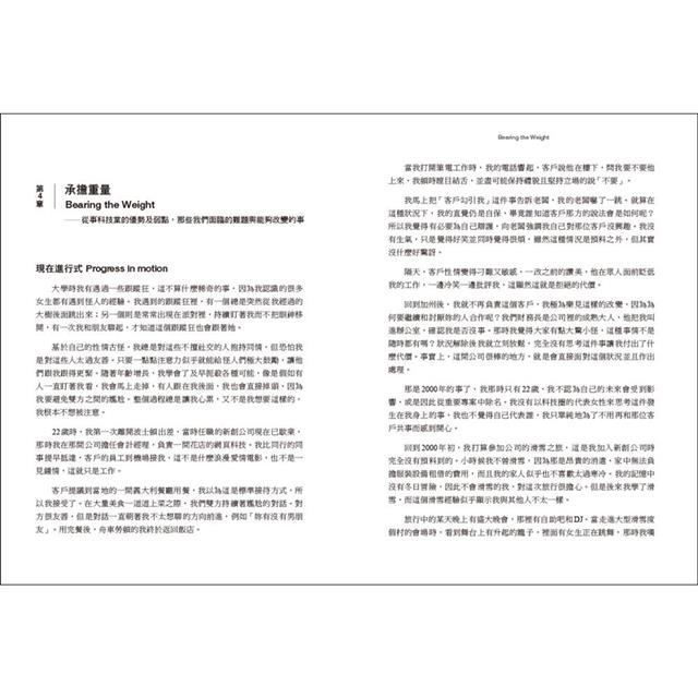 問我是否有過這種念頭:「如果我是男生,那我就不必費力說服大家了。」事實上,我沒有,因為那時我還完全沒有意識到這一點。我覺得對我能力的質疑似乎都很合理,畢竟我所遵循的是古老信念:「裝久了就會變成真的。」我也沒有和周遭的人比較,或是認為其他人擁有成功的特殊捷徑。