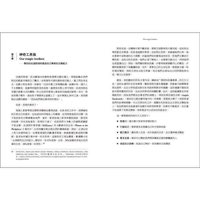 而我所煩惱的是,並非故事中的每個人都認為自己屬於科技行業。我們並非生於能夠對遠大目標抱持信心的世界中,也不是每個人都擁有光鮮亮麗的職業經歷,這樣的事實讓我感到悲傷,我又該如何帶來影響?我想要突破有限故事所創造的界線,讓我們看見已存在我們之間的多樣性。在書中,我們可以看見每位擁有自己獨特超能力的女性們,談論探索職涯的各種方式、彼此幫助、所承擔的壓力以及遇到的機會,最後更透過深入挖掘女性為何留下或離開科技業的故事,讓我們能夠找到最好的方式,去支持彼此與下個世代的人才。