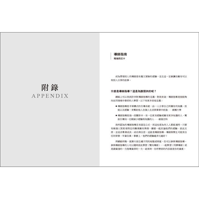 在本書的研究和撰寫過程中,亞蘭娜.凱倫蒐集了多本珍貴的書籍資源,針對各主題提供更深入的延伸閱讀,你可以透過這份推薦書單,進一步獲得工作建議和啟發;此外,書中的「導師指南」與「騷擾防止與協助」也提供了尋找職場貴人的方法、應對職場騷擾的支援等。妥善運用擁有的工具,有助於讓我們在職場的修練與冒險中,自信向前邁進!