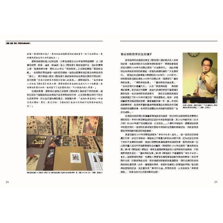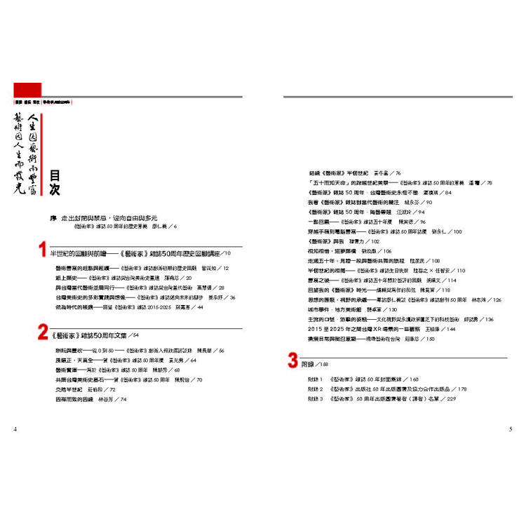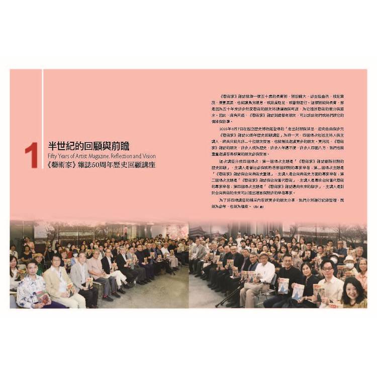 本書收錄2025年6月7日在國立歷史博物館登場的「走出封閉與禁忌,迎向自由與多元―《藝術家》雜誌50周年歷史回顧講座」內容,針對每場不同的研討主題分別進行記錄整理,既可做為閱讀參考也做為檔案留存,以期與更多的朋友分享。此外,多位與藝術家雜誌雜誌社交往深厚的專家學者為《藝術家》雜誌寫下回憶、祝賀與期盼,擔任海外撰述的作者也分享各自多年來的經驗,無疑是珍貴且動人的印記。