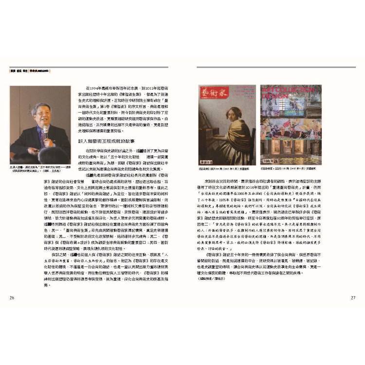 事實上,過去50年的歲月中,何社長曾經經歷許多事情,其中包括作者文章碰到禁忌的困擾,也曾受邀到其他國家創辦《藝術家》雜誌,卻都不曾阻礙他堅持在台灣繼續走下去的信念。這個雜誌,不但為藝術在台灣社會開拓了日益寬廣的發言空間,也在其他思想與言論仍受限制的地方成為看見世界的窗口,那個地方許多大學會以擁有出版至今完整的《藝術家》雜誌感到無比光榮。這些事情,何社長胸襟寬闊,選擇低調,不願大聲嚷嚷。