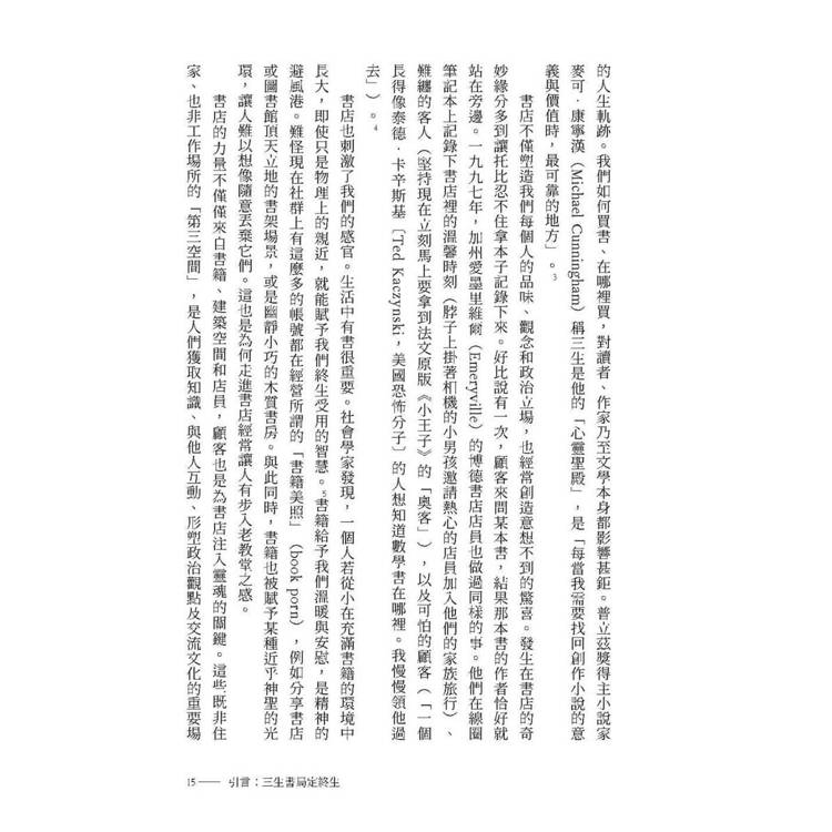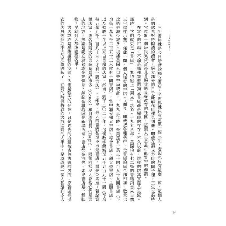 書店或許是瀕臨絕種的空間,卻也是強大的存在,只是它們的力量被古色古香的店面、穿著開襟毛衣的店員等揮之不去的形象遮蔽了。在對的時機將對的書放進對的人手中,足以改變一個人甚至許多人的人生軌跡。我們如何買書、在哪裡買,對讀者、作家乃至文學本身都影響甚鉅。普立茲獎得主小說家麥可.康寧漢(Michael Cunningham)稱三生是他的「心靈聖殿」,是「每當我需要找回創作小說的意義與價值時,最可靠的地方」。