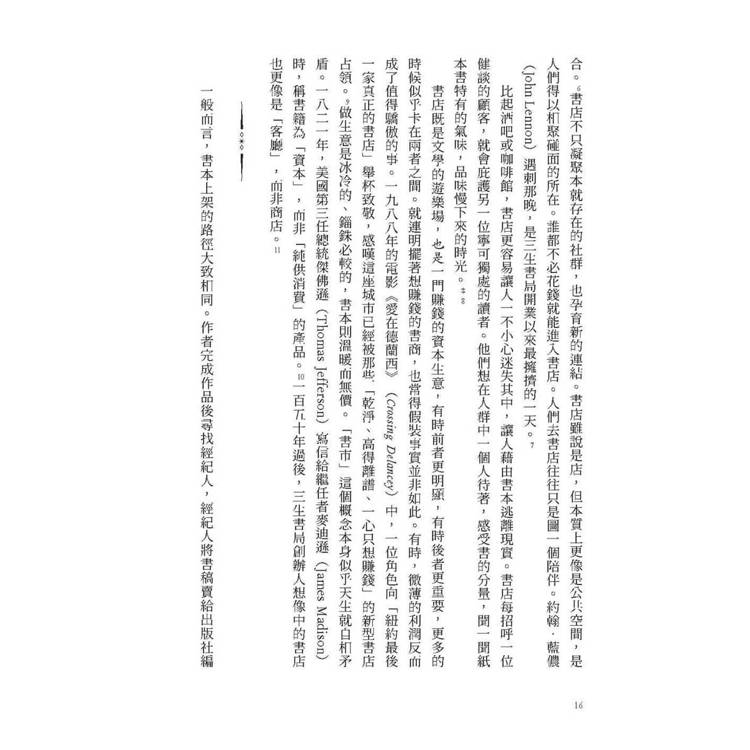 書店既是文學的遊樂場,也是一門賺錢的資本生意,有時前者更明顯,有時後者更重要,更多的時候似乎卡在兩者之間。就連明擺著想賺錢的書商,也常得假裝事實並非如此。有時,微薄的利潤反而成了值得驕傲的事。一九八八年的電影《愛在德蘭西》(Crossing Delancey)中,一位角色向「紐約最後一家真正的書店」舉杯致敬,感嘆這座城市已經被那些「乾淨、高得離譜、一心只想賺錢」的新型書店占領。做生意是冰冷的、錙銖必較的,書本則溫暖而無價。「書市」這個概念本身似乎天生就自相矛盾。一八二一年,美國第三任總統傑佛遜(Thomas Jefferson)寫信給繼任者麥迪遜(James Madison)時,稱書籍為「資本」,而非「純供消費」的產品。一百五十年過後,三生書局創辦人想像中的書店也更像是「客廳」,而非商店。