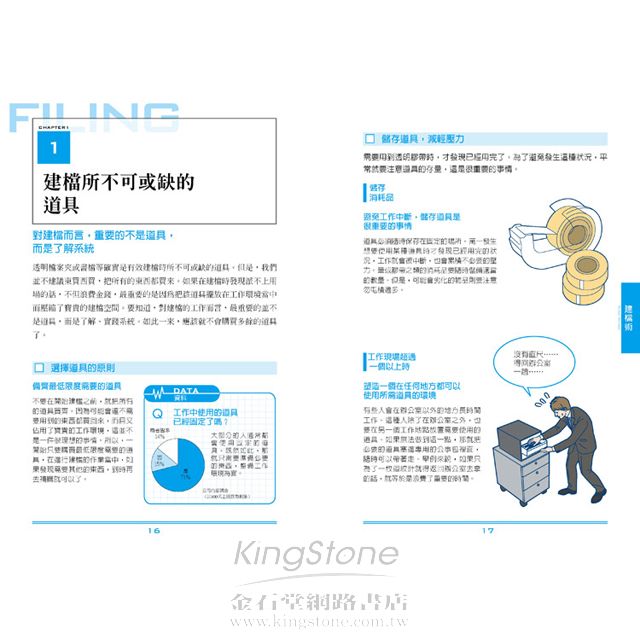 ★用「檢視」、「NG」、「DATA」、「採訪」等四大項分類穿插書內做簡單直白的圖示與文字,讓讀者一看就懂。EX.在第1篇〈建檔所不可或缺的道具〉中,「DATA」部分列出透明資料夾、書擋、主題標籤、檔案盒等工具,「NG」部分說明不要過度依賴高科技產品。並且在大篇章之後列出實際案例。