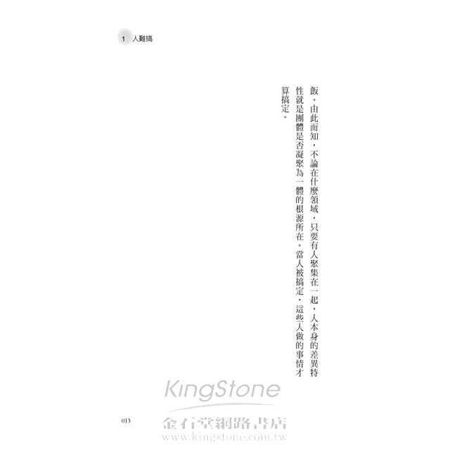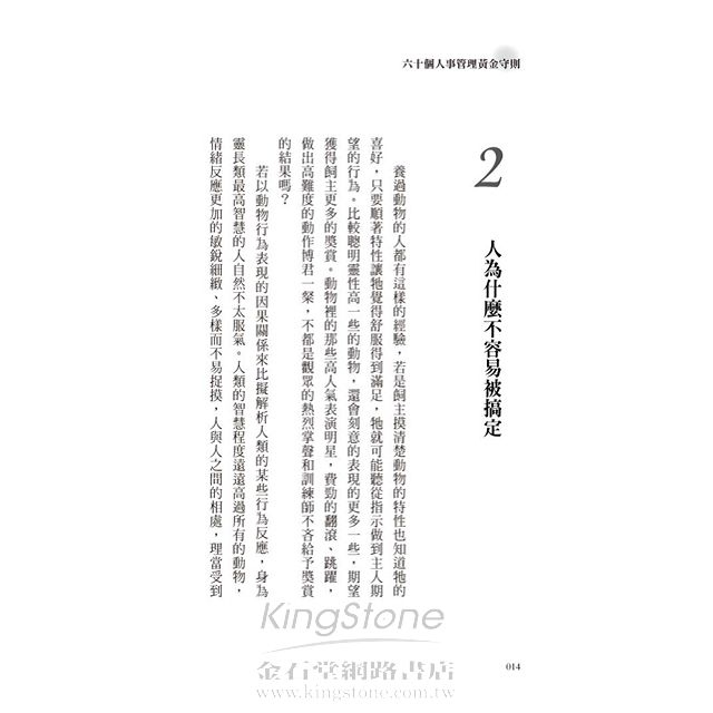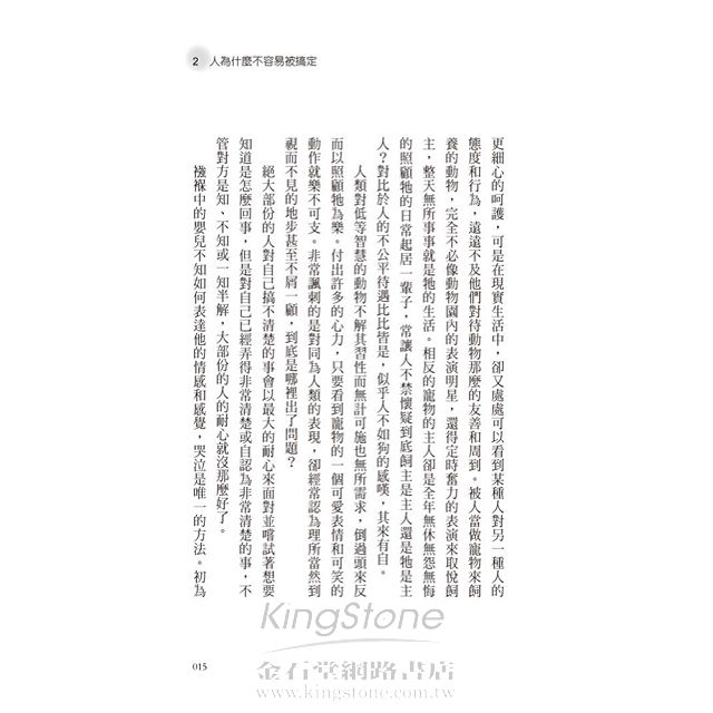 1人難搞找個機會問一問你週遭的人,到目前為止他們認為最難搞的事是什麼?不論得到的答案是多麼的稀奇古怪令人噴飯,或是老生常談的普通,這些難搞的事終究都讓人牢記在心或積怨難消。如果時光能倒流,讓這些被認為是難搞的事重新來過,不論對錯是非都可以完全照著自己的意思來做,那些橫生阻礙讓人心生不滿甚至為之氣結的感覺就不會存在,事情當然也不再被視為難搞。雖然事情完全依個人的自由意志進展而變得順利了,可也沒人敢保證事情的結果必然更好。個人自由意志的伸展強度和事情是不是難搞之間,似乎有極為強烈的關連。自由意志是否如願的伸展,取決於週遭人想法、做法堅持的強度。他強你弱做法南轅北轍時,你就會覺得事情變得棘手難行,既不順心也不順手。想要順心順手,勢必得花費很大的氣力先搞定那些和你意見、立場相左的那些人,因此而花費的精力遠比做事本身多得多。在人生或職場上翻滾數十載的老手,毫無例外會異口同聲的感嘆:做人比做事難多了!換句話說,得先搞定那些持不同立場、想法、做法的人,之後才能成事。那些有辦法搞定人的問題的人,他們的成就比起只會做事的人大得多,全世界各行業的領袖幾乎都具備能言善道、折衝協調、長袖善舞的特質,偶爾看到這些人真正動手做些事時,都會驚訝於他們的笨拙可笑!在共同生活一段時間後,因為各種不同的原因而離異。分手的原因雖然千奇百種,但終究是二人在共同生活一段時間後,仍然相互搞不定對方,才有分開的結局。二個人已經是人與人相處的最小團體了,因為全世界的合法婚姻都採登記制,我們才會明確的知道世間規模最小的二人團體,在法律強烈保障彼此關係的保護傘之下,依然有一半走上麻煩的法律程序,徹底的解除已經公告的關係,那些沒有婚姻束縛的男女交友,分分合合更是家常便飯。由此而知,不論在什麼領域,只要有人聚集在一起,人本身的差異特性就是團體是否凝聚為一體的根源所在。當人被搞定,這些人做的事情才算搞定。2人為什麼不容易被搞定養過動物的人都有這樣的經驗,若是飼主摸清楚動物的特性也知道牠的喜好,只要順著特性讓牠覺得舒服得到滿足,牠就可能聽從指示做到主人期望的行為。比較聰明靈性高一些的動物,還會刻意的表現的更多一些,期望獲得飼主更多的獎賞。動物裡的那些高人氣表演明星,費勁的翻滾、跳躍,做出高難度的動作博君一粲,不都是觀眾的熱烈掌聲和訓練師不吝給予獎賞的結果嗎?若以動物行為表現的因果關係來比擬解析人類的某些行為反應,身為靈長類最高智慧的人自然不太服氣。人類的智慧程度遠遠高過所有的動物,情緒反應更加的敏銳細緻、多樣而不易捉摸,人與人之間的相處,理當受到更細心的呵護,可是在現實生活中,卻又處處可以看到某種人對另一種人的態度和行為,遠遠不及他們對待動物那麼的友善和周到。被人當做寵物來飼養的動物,完全不必像動物園內的表演明星,還得定時奮力的表演來取悅飼主,整天無所事事就是牠的生活。相反的寵物的主人卻是全年無休無怨無悔的照顧牠的日常起居一輩子,常讓人不禁懷疑到底飼主是主人還是牠是主人?對比於人的不公平待遇比比皆是,似乎人不如狗的感嘆,其來有自。人類對低等智慧的動物不解其習性而無計可施也無所需求,倒過頭來反而以照顧牠為樂。付出許多的心力,只要看到寵物的一個可愛表情和可笑的動作就樂不可支。非常諷刺的是對同為人類的表現,卻經常認為理所當然到視而不見的地步甚至不屑一顧,到底是哪裡出了問題?絕大部份的人對自己搞不清楚的事會以最大的耐心來面對並嚐試著想要知道是怎麼回事,但是對自己已經弄得非常清楚或自認為非常清楚的事,不管對方是知、不知或一知半解,大部份的人的耐心就沒那麼好了。襁褓中的嬰兒不知如何表達他的情感和感覺,哭泣是唯一的方法。初為人父母的夫婦,只有那麼一點得自於書本片段的育嬰知識,在欠缺實際養兒育女經驗的支撐下,聽到嬰兒的啼聲則足以亂其分寸,沒有一對夫婦不是耐著性子的用盡各種方法,想要知道嬰兒到底為何哭鬧不休。當哭泣的嬰兒破涕而笑的一瞬間,手忙腳亂滿頭大汗的父母方才如釋重負滿心開懷。如果這樣的場景發生在已經就學、略為懂事的小童身上,父母的反應可是大大的不同。哭鬧的小孩換來的大部份是父母親的高聲斥責或一頓痛打,為什麼同樣是自己的小孩,類似的行為會有完全不同的反應?因為這個時候的父母親自認為完全知道小孩的哭鬧是為了甚麼,也認為小孩應該知道父母親的需求標準是什麼。這般的無理取鬧,自然輕易的挑起父母親憤怒的情緒。我認為你應該知道,我也完全知道你的意圖,這樣的自以為是,正是人為什麼不容易被搞定的元凶。