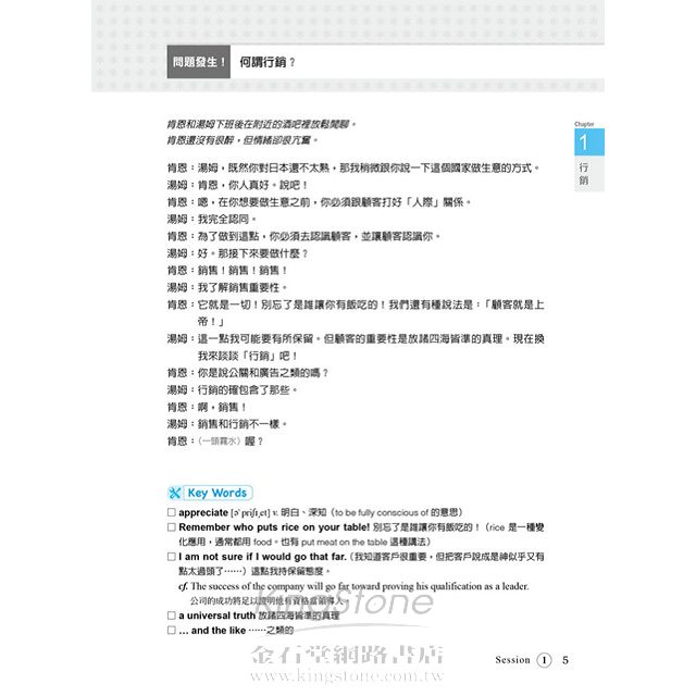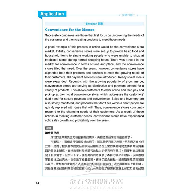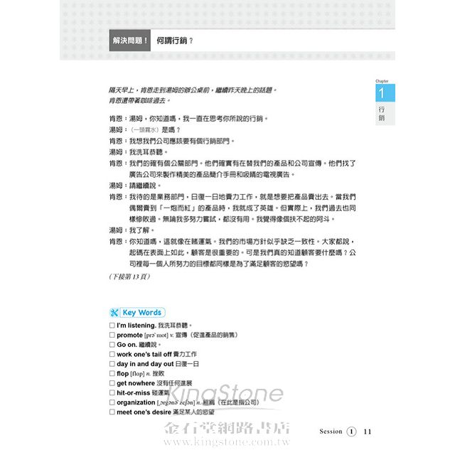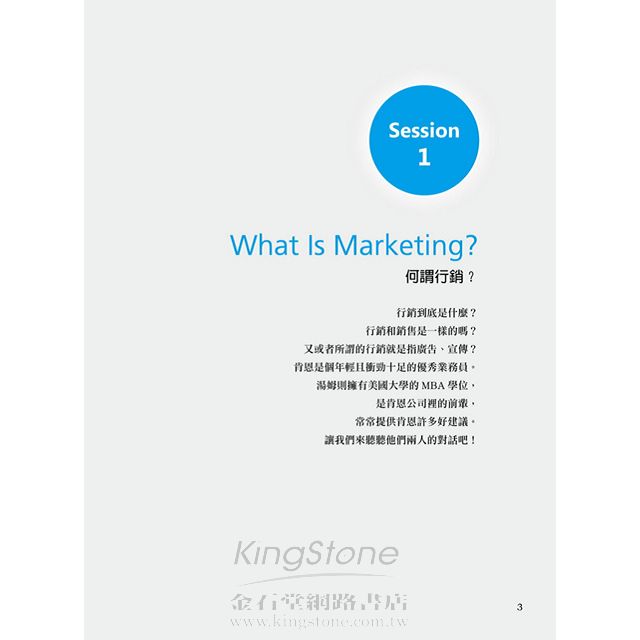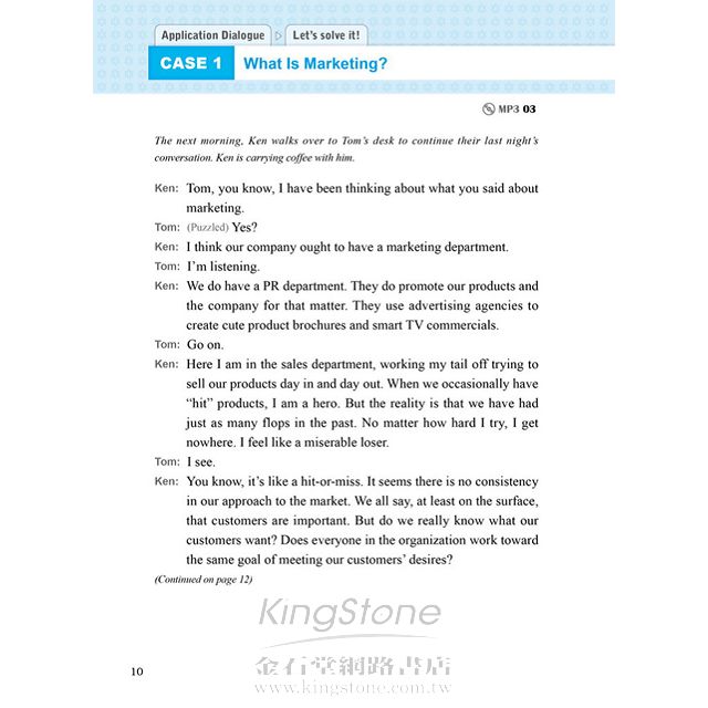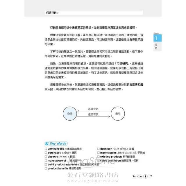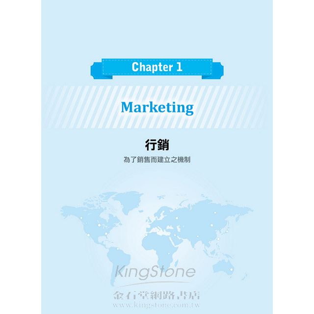 管理大師曾說過:「企業的唯一有效定義就是創造顧客。」而「行銷」正是實現上述定義之關鍵「企業功能」(business function)。本章中除了說明「行銷的定義」外,更提出了「策略行銷」(strategic marketing) 的架構,即「3Cs 市場分析」、「目標行銷」 (target marketing;STP) 與大家熟悉的「行銷組合─4Ps」的商務英語環境模擬。