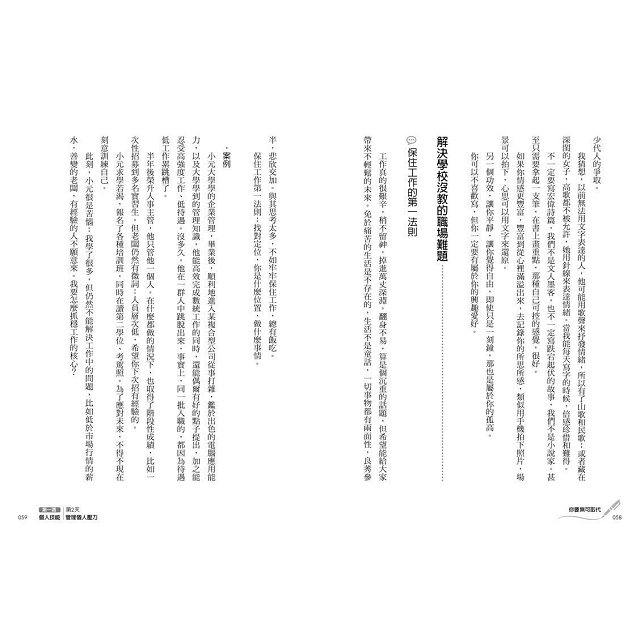 .1:增加「剩餘價值」:職涯中難免遇到轉場,可能是你想離職、或被開除,這時候你應該怎麼辦?其實從進入職場開始,你就要思索,自己有哪些剩餘價值,並增加自己的「被利用」價值。