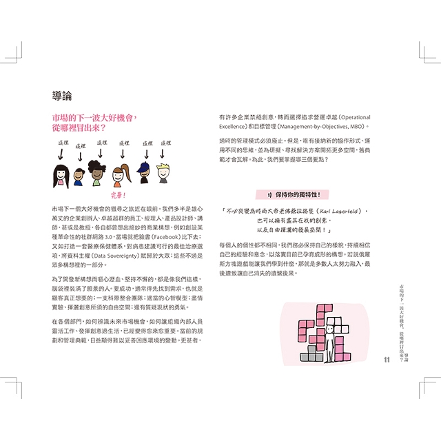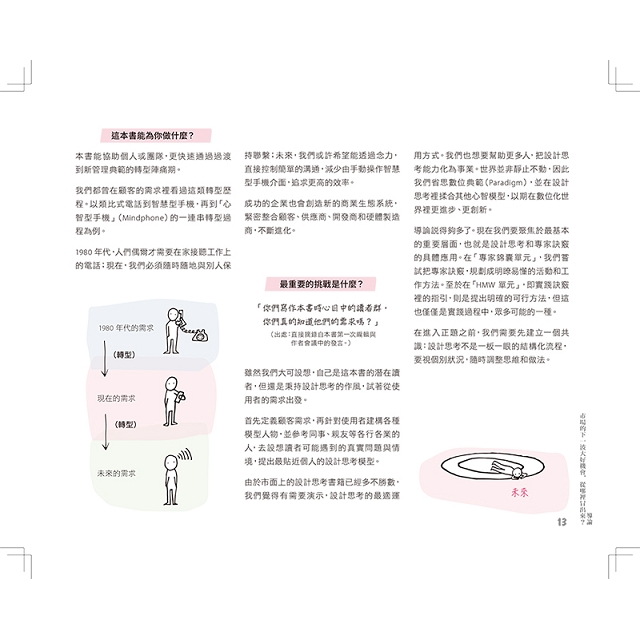不論你是加入創新專案的新手、帶領數位轉型的經理人還是準備開發服務的創新者,這本書都能夠幫助你全方位了解的設計思考──看清盲點、找到工具、協作共創。