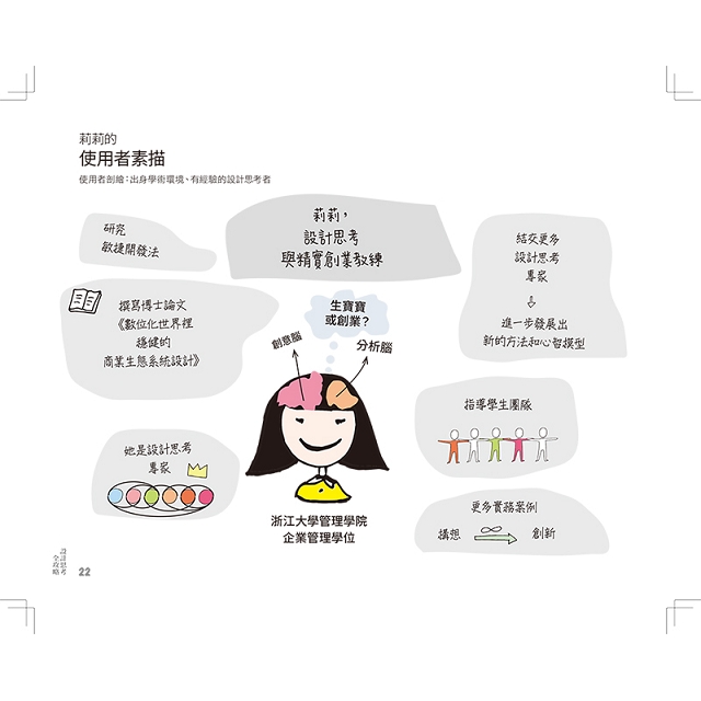 雖然我們大可設想,自己是這本教戰守策的潛在讀者,但還是秉持設計思考的作風。首先定義顧客需求,再針對使用者建構各種模型人物,並參考同事、親友等各行各業的人,去設想讀者可能遇到的真實問題與情境,提出最貼近個人的設計思考模型。