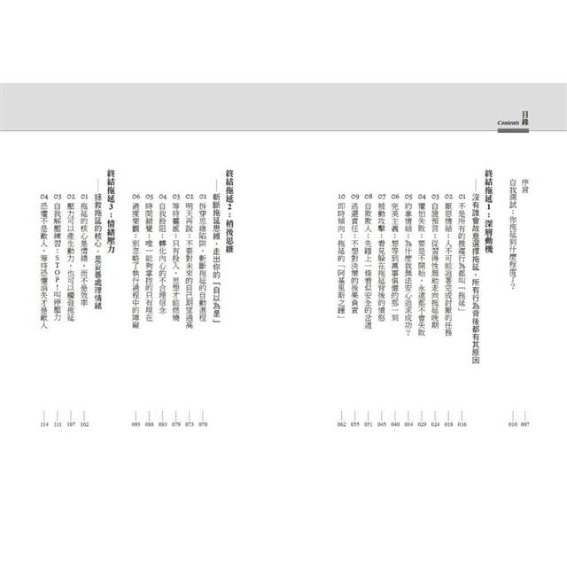 將拖延歸咎於懶惰、效率不佳無法解決問題,拖延者最需要的,是理解自己背後的深層動機,找到自己在逃避的究竟是什麼?本書將導致拖延的原因整理成7大陷阱,深入淺出地剖析每種拖延現象,幫助讀者識別出自己遭遇的困境與情緒盲點,並針對各個問題提供具體的應對策略。