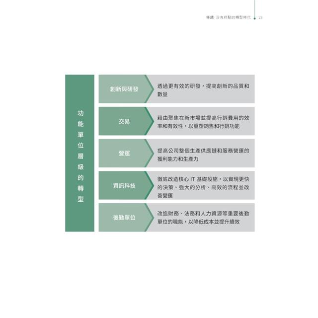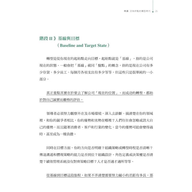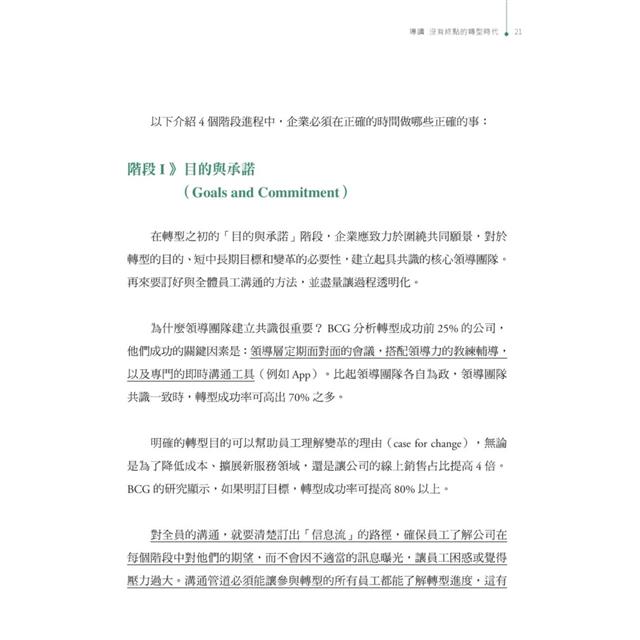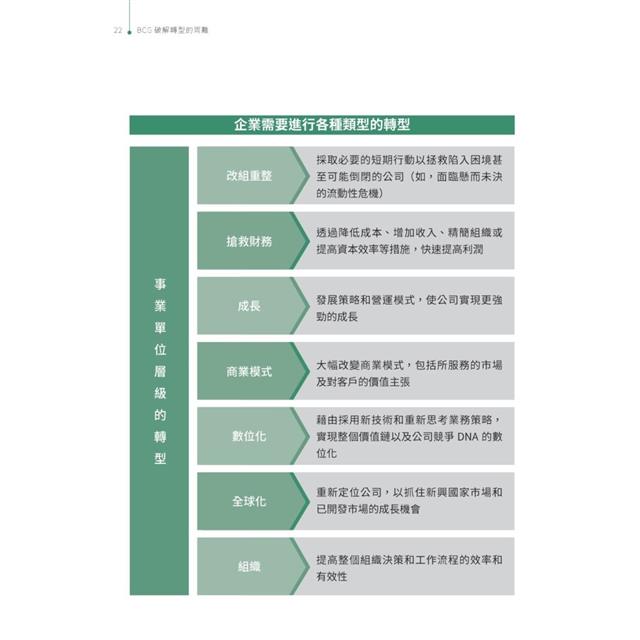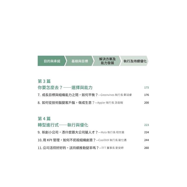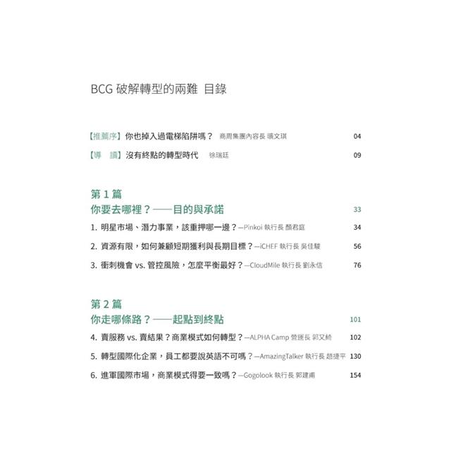 全書以企業轉型的4階段為架構,分4大篇,共11章QA對談精華。編輯擷取重點並輔以BCG理論圖表說明,協助讀者由個案的「點」,看到完整的「面」。