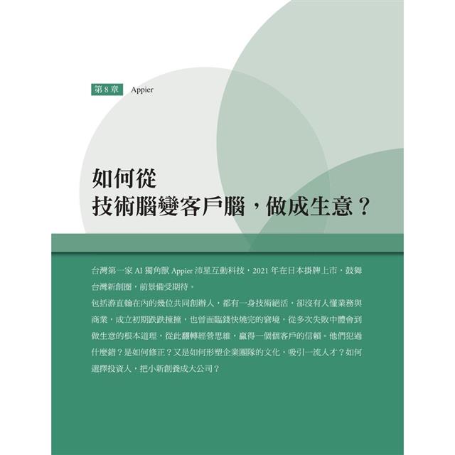 包括游直翰在內的幾位共同創辦人,都有一身技術絕活,卻沒有人懂業務與商業,成立初期跌跌撞撞,也曾面臨錢快燒完的窘境,從多次失敗中體會到做生意的根本道理,從此翻轉經營思維,贏得一個個客戶的信賴。他們犯過什麼錯?是如何修正?又是如何形塑企業團隊的文化,吸引一流人才?如何選擇投資人,把小新創養成大公司?