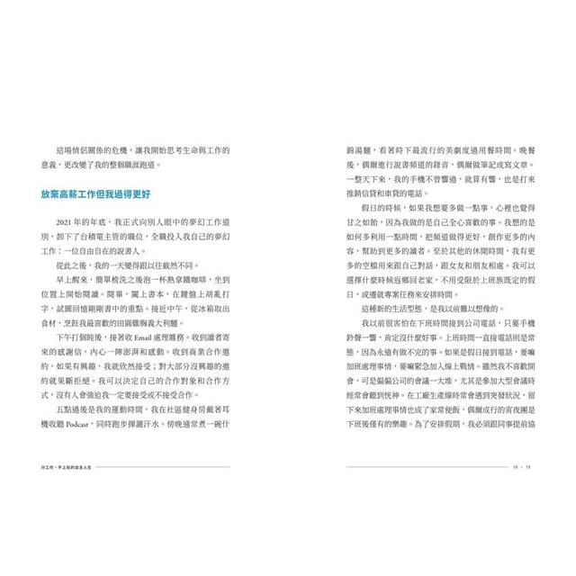 新的工作型態──我的夢幻工作──給予我高度的自由,讓我擁有充分的使命感,以及不亞於以往的總薪酬。但伴隨而來的,是更嚴苛的自律要求、做出決定的壓力,還有不像以往穩定的收入金流。