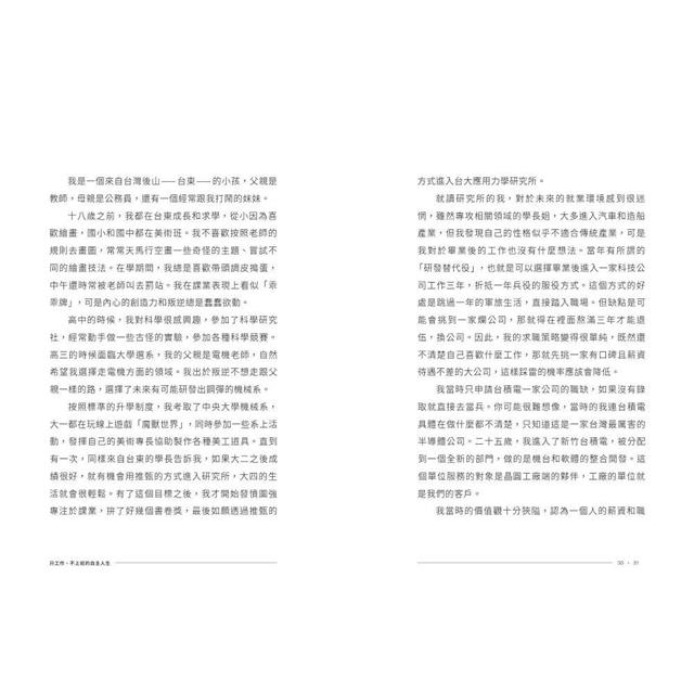 我從台大應用力學研究所畢業之後,就直接進入台積電服研發替代役。從新鮮人開始,我就抱持著一種「工作至上」的兢兢業業態度,總是對每一次的任務和專案投入全力。我完全不在乎加班或犧牲假日和伴侶相處的時間,只想要爭取最好的表現,獲得最快的晉升加薪。這種使命必達的工作態度獲得了回報,我如願以優異的表現持續晉升。但是在這個過程當中,我逐漸失去了自我。我打從心底相信「一個人的職位和薪水高低,代表一個人的成就」。
