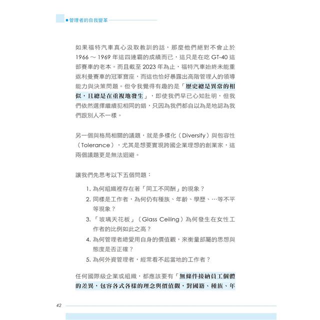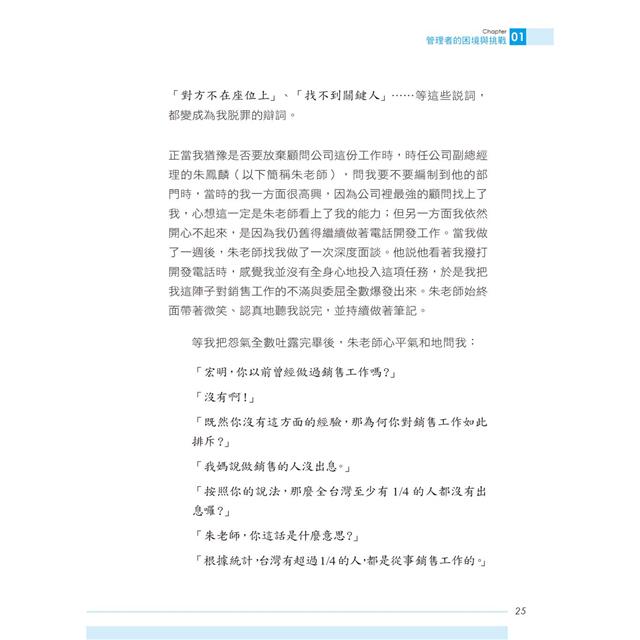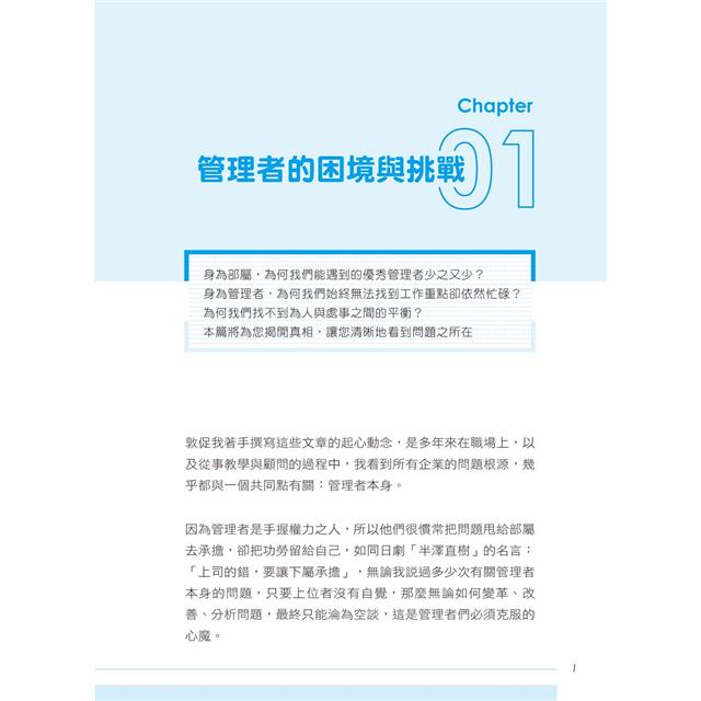 本書透過作者的現身說法以及所見所聞,解析管理者當前的困境與挑戰,當下必須先改變什麼,才能讓部屬立即有感?未來又該做些什麼,才能讓自己超前部署、立於不敗之地?