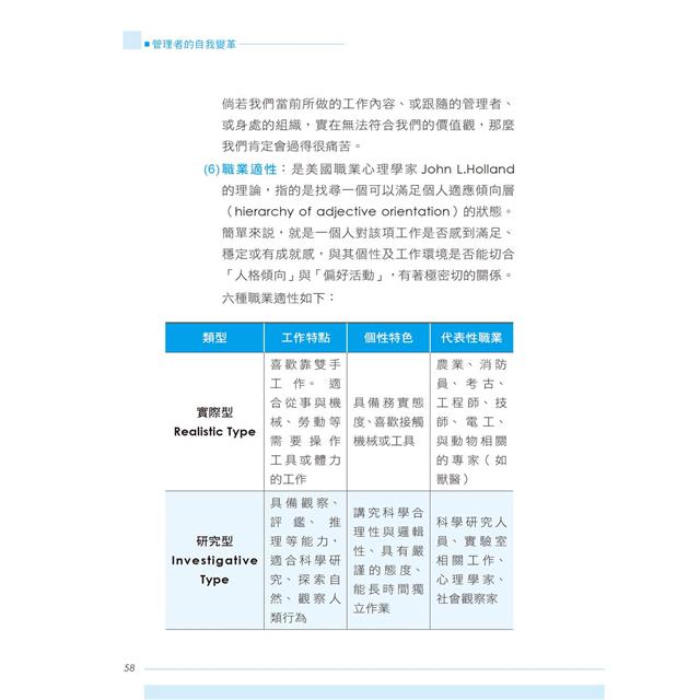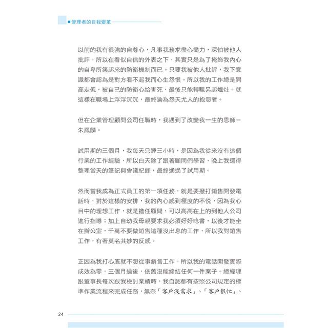 確實,透過管理,可以讓我們生活得更好。那麼…誰才是管理者呢?是主管嗎?並不完全是,因為我們每一個人都可以是自己的管理者。隨著網路與科技快速的發展,我們所面臨的環境瞬息萬變,過往熱門的職業很多已被淘汰,現今的熱門職缺未來也不一定會繼續存在,所以我們每一個人都必須具備自我變革的能力,才能順應時代的變遷,而且也只有當我們成為自己的管理者,才有能力掌控自我變革。如果你是個主管,《管理者的自我變革》深刻地明白主管當前的處境,同時提供突破困局的解方,能夠讓你成為一個真正的領導者。如果你還不是主管,那麼《管理者的自我變革》能夠讓你知己知彼,瞭解如何與管理者互動,營造一個可以共好共榮的職場環境。