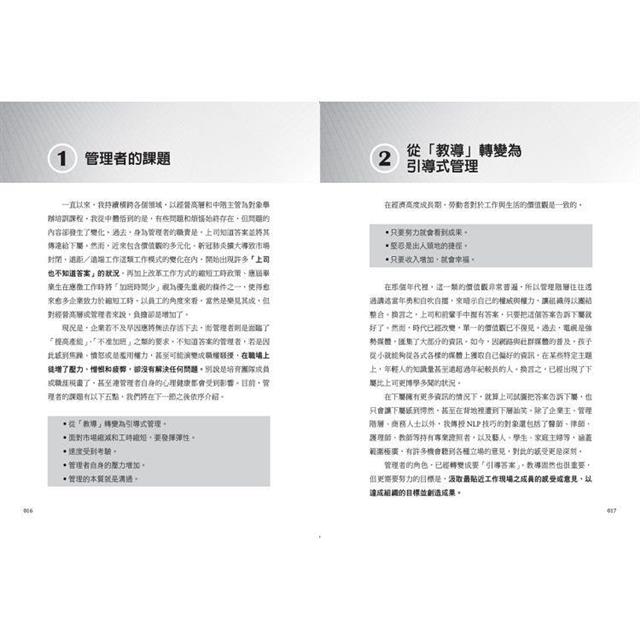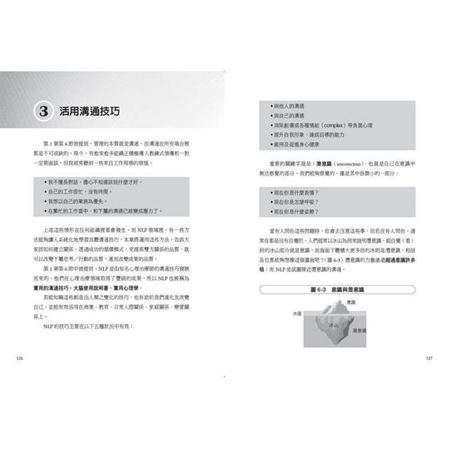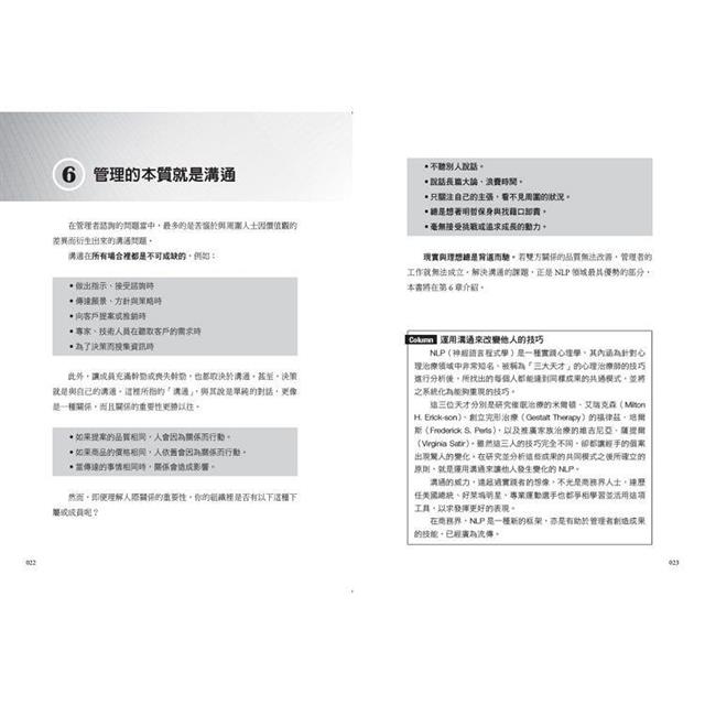 本書將重點集中於管理者的目標達成、心理狀態、溝通技巧、以及思維框架,並透過案例深入淺出地講解可付諸實行的NLP技術。幫助管理者解決日常面臨的組織問題,不僅能有效解決團隊現階段停滯不前的困境,還能讓組織達成目標,有效提升績效!