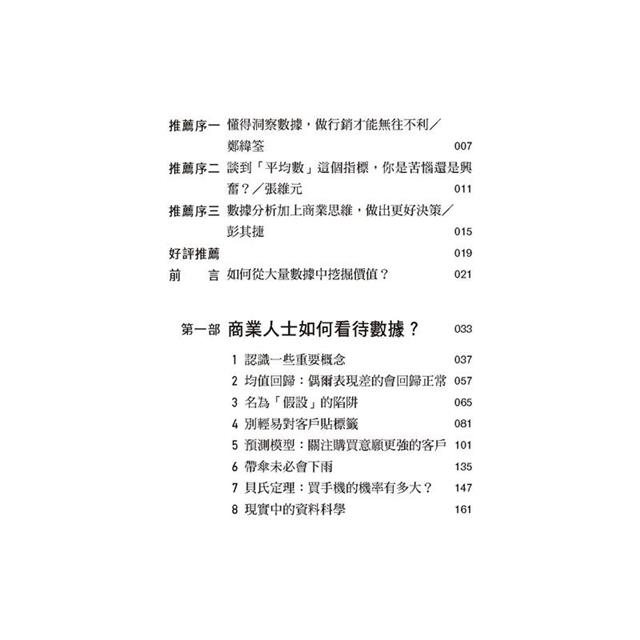 我在職場打滾的十多年經驗中,每天都會接觸到各類的數據決策場景。如果我們還是習慣只使用「平均值」這把武器,並不足以面對各種挑戰。本書彙整了許多重要的商業數據分析方法,搭配易懂的語彙,幫助讀者習得重要的理論素養,是本書的核心價值。