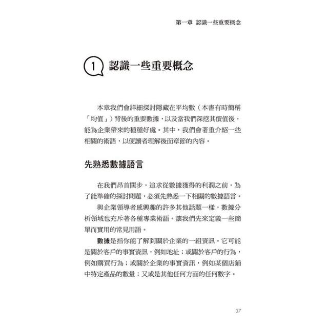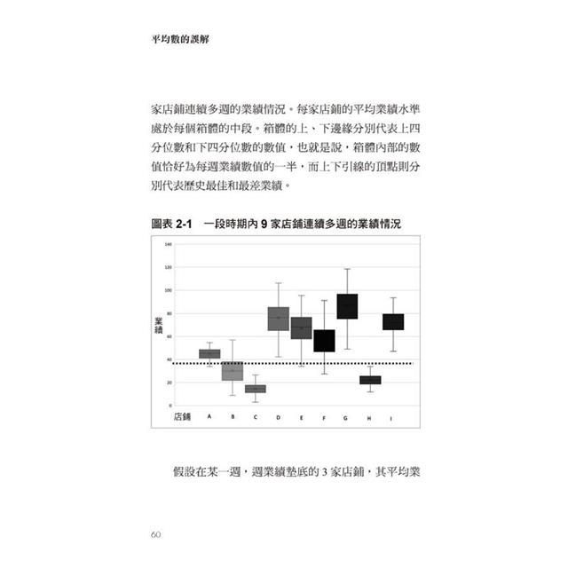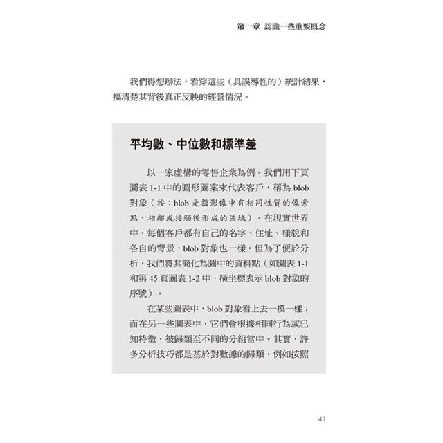 本書從「平均數的誤解」作為出發點,開宗明義點出許多人在工作上,常套用平均數來分析數據的缺點。例如在商業市場中,大多數的訂單經常來自於忠實顧客,而非新顧客,因此如果單純將不同群的顧客以平均消費指標作為代表,反而局限了分析的可能性,導致許多重要商業觀點被忽略。