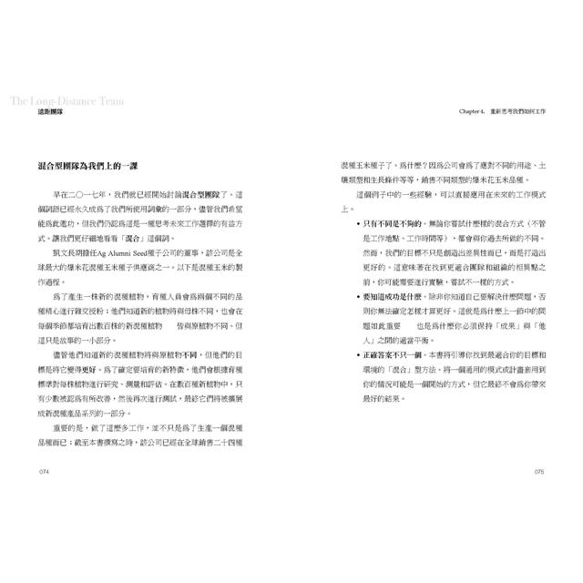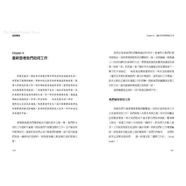 •合作Collaboration——遠距領導者一直被誤導的想法,若想要擁有合作的團隊,就必須先有實體的在場(physical presence)。但事實上,距離的遠近與合作的成功沒有關係。