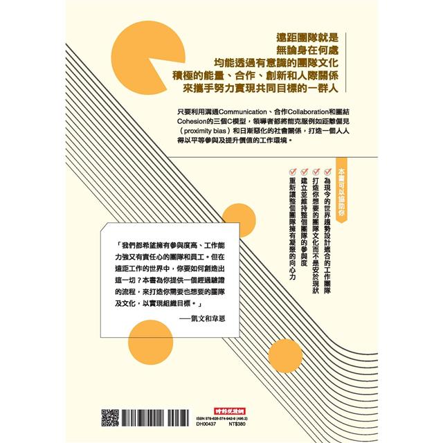 我們都希望擁有參與度高、工作能力強又有責任心的團隊和員工。但在遠距工作的世界中,你要如何創造出這一切?本書為你提供一個經過驗證的流程,來打造你需要也想要的團隊及文化,以實現組織目標。――凱文和韋恩(本書作者)