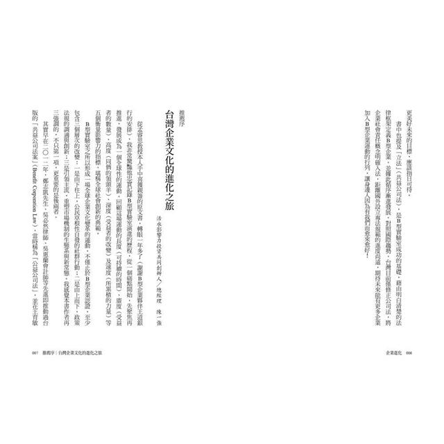 其實早在二○一二年,鄭志凱先生、吳必然律師、吳惠蘭會計師等先進即推動過台版的「共益公司法案」(Benefit Corporation Law),當時稱為「公益公司法」,並在王育敏委員支持下通過二讀,但未付三讀(第一次嘗試)。二○一七年,公司法修法百年機遇之時,謝謝方嘉麟教授、方元沂教授的努力,許毓仁、黃國昌等跨黨派委員曾提出不同版本的「共/兼益公司法專章」,後於二○一九年初,邀請到本書中提到的比爾‧克拉克律師親自來台,雖然功敗垂成無緣進入二讀,卻促成公司法第一條增列「得採行增進公共利益之行為,以善盡其社會責任」的條文(第二次嘗試)。二○二○年,方元沂教授再接再厲,將共益公司法案的理念延續於行政院的社會創新政策之中,提出「社會創新事業組織」專法草案(第三次嘗試)。迄今,共益公司法案在台灣旅行竟長達十二年之久。衷心期待事不過三,新國會新會期能通過相關法案,更積極促成台灣企業文化的大進化。