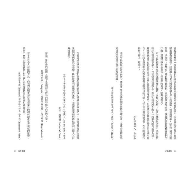 資本主義社會中,企業一直扮演重要的角色,但是隨著半世紀以來的經濟發展,企業愈來愈強調股東利益優先,卻忽略客戶、員工、社區、環境的利益,結果導致經濟不平等、氣候變遷、環境惡化、勞工權益受損等種種問題。不過,有一群企業家對此不以為然,他們集結起來,共同推動B型企業運動,包括達能集團、聯合利華、巴塔哥尼亞等跨國企業集團,還有綠藤、鮮乳坊等公司,全都接連響應。
