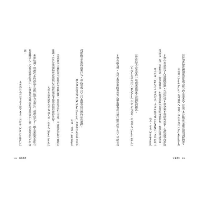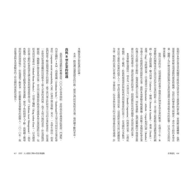 可能是因為如此跨域的人生經驗,讓他得以一種更寬廣的社會人文角度來觀察企業,特別在企業策略、社會創新、企業家精神與永續發展等領域,這種濃濃的個人色彩在這本書中展露無遺,字裡行間充斥著對資本主義追求利潤極大的失望,及對企業能夠、也必須改革資本主義的無比期待,而這希望的星星之火是自民間自發成立的B型實驗室開始,至今已遍布全球、甚至擴及到每一個人,透過「倫理消費」來影響企業。