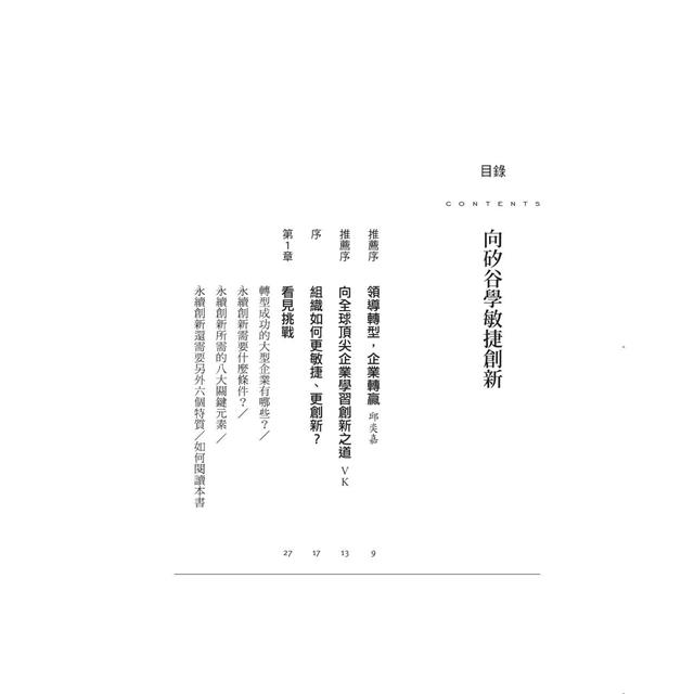 「轉型與創新是所有企業經理人必須參與的戰役,這本書為摸黑匍匐前行的企業經理人指引了光的方向,也帶來了齊全的裝備。當一個企業理解並一一實踐了這些特質,一定能在競爭激烈的市場環境中找到立足點,也能為長遠的發展奠定堅實的基礎。」
