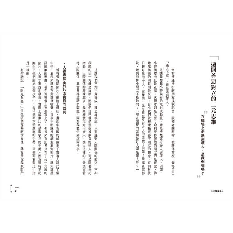 基於以上兩個體悟:一是人很容易基於片面資訊而誤判,二是真實人性總是善惡交織、難以分辨,所以我訓練自己在面對人際衝突時,盡量不要用「非黑即白的二分法」來看事情。