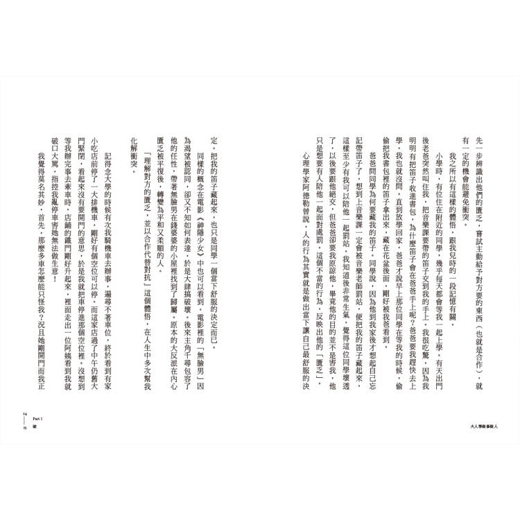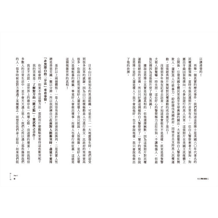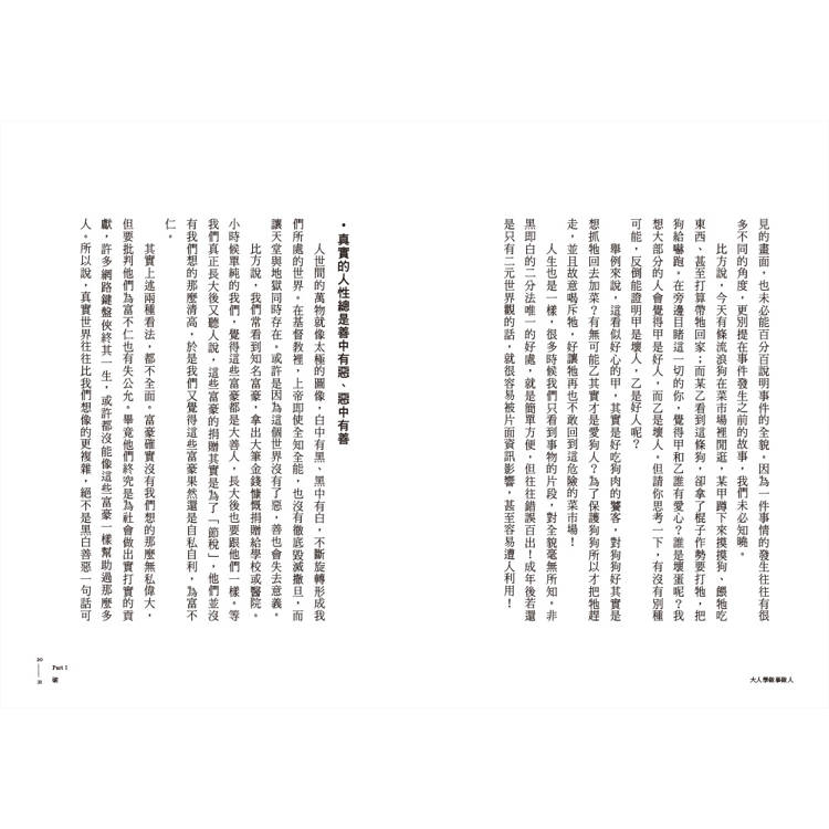 當然,我不是要你去質疑身邊所有的人,也不是要強調父母的愛有條件,我只是希望大家不要往極端靠攏,不要覺得人一定邪惡或一定無私,因為絕大部分的人都是介於中間,都是軟弱的一般人。人有欲望、夢想,有時只顧自己,有時卻也會想做好事。這就是人。只要你對人有正確的認知就不會失望。更重要的是,只要你讓自己成為一個友善、能夠與人合作的人,不管在學校還是職場,我相信大部分人都不會刻意害你。所以不用去揣摩對方是好人或壞人,只要都把他們當成自私的人,然後去思考:「我可以怎麼幫他,讓他達成目的?」
