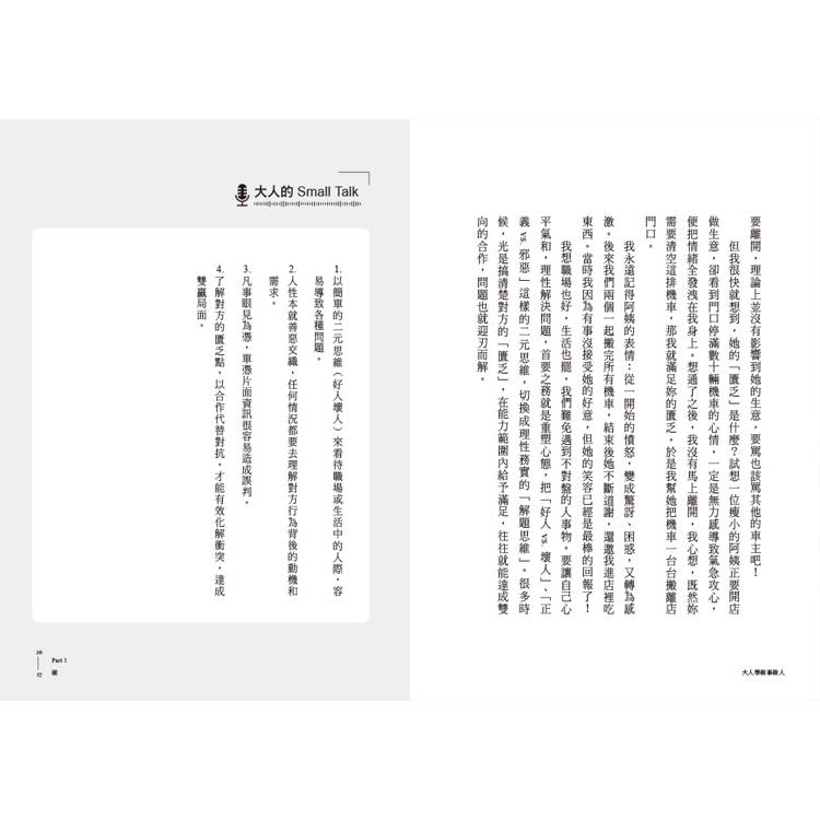 我想職場也好,生活也罷,我們難免遇到不對盤的人事物。要讓自己心平氣和,理性解決問題,首要之務就是重塑心態,把「好人 vs. 壞人」、「正義vs. 邪惡」這樣的二元思維,切換成理性務實的「解題思維」。很多時候,光是搞清楚對方的「匱乏」,在能力範圍內給予滿足,往往就能達成雙向的合作,問題也就迎刃而解。