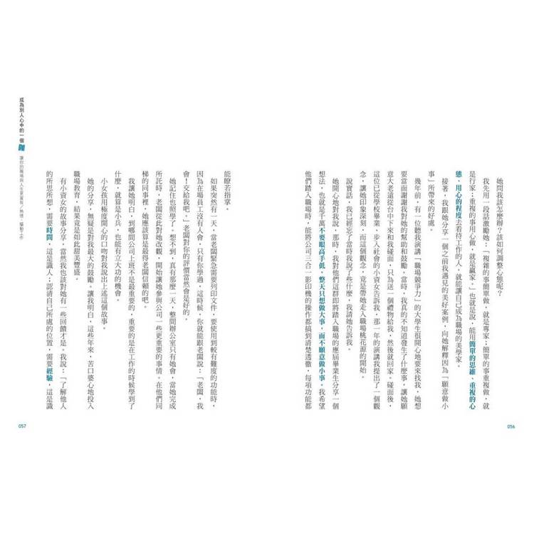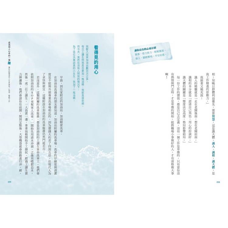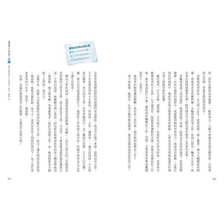 這些故事所要傳遞的,也正是書中的四大篇章:「熱情工作」、「創意業務」、「行動人生」與「美好信念」。在每一個主軸中,我用自己的親身經歷告訴讀者,能夠開放心懷無私付出、樂在工作創造績效、善用人脈達成目標、幫助別人成就自己,是多麼令人開心的事。