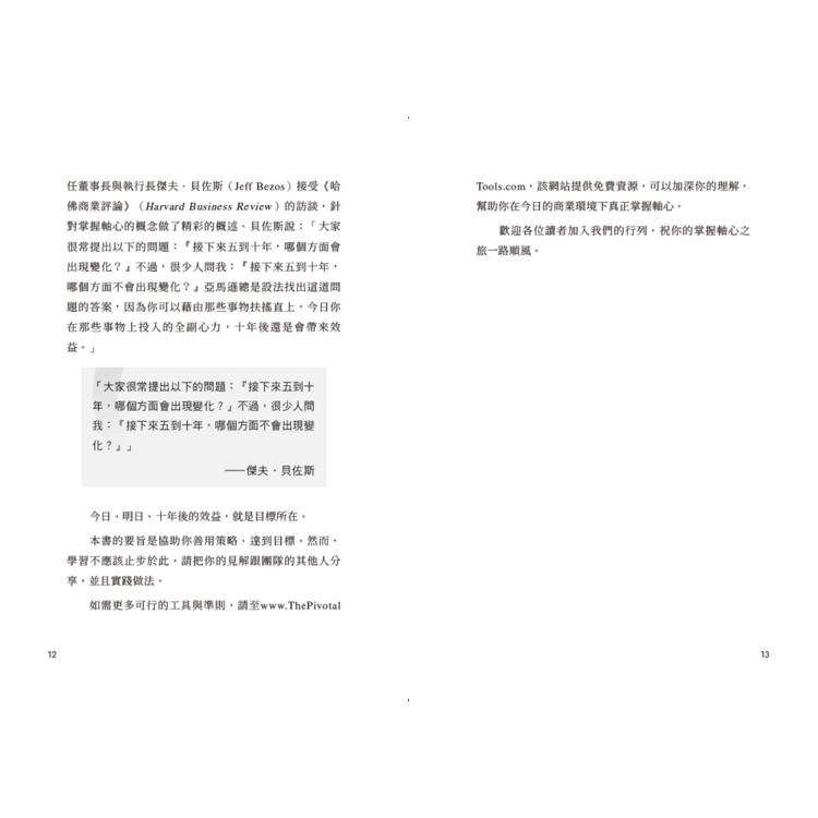 如需更多可行的工具與準則,請至www.ThePivotalTools.com,該網站提供免費資源,可以加深你的理解,幫助你在今日的商業環境下真正掌握軸心。