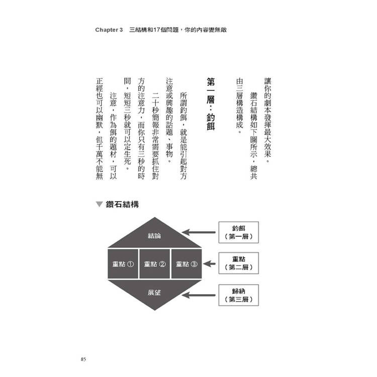在本書後續的內容中,也貫徹了這樣的思維。不論是釣餌、重點、歸納的鑽石結構,提前模擬問題的17道練習題,還是簡報當下需要準備的道具、穿著打扮、手勢音調等,所有的一切,都是圍繞對方,預想了所有可能遭遇的情況,而做出的準備。