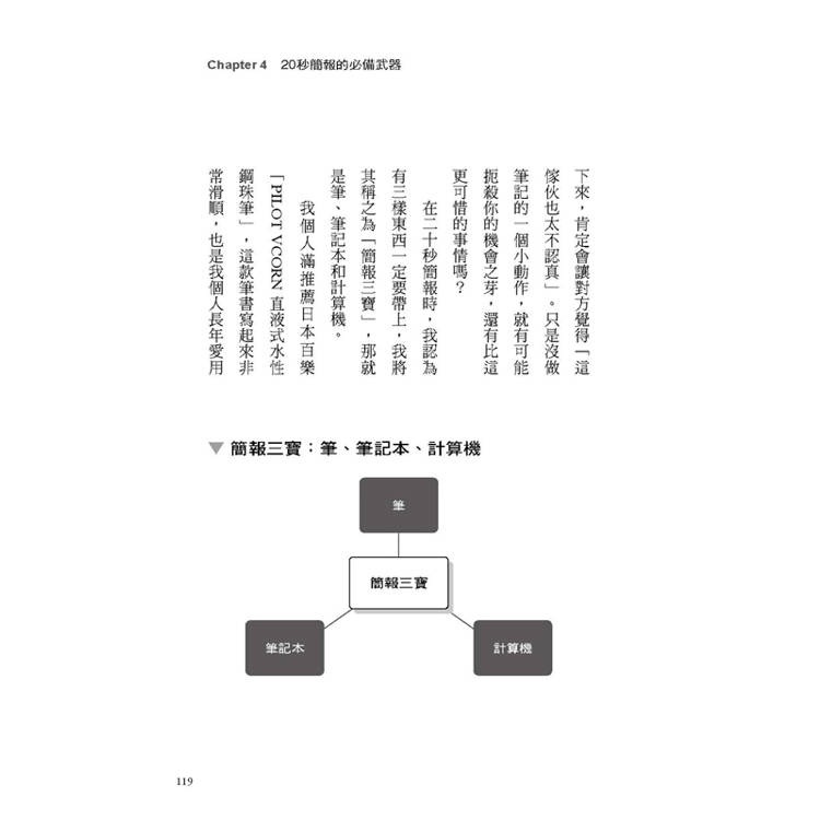 當我一開始翻閱這本書,馬上吸引我目光的,就是作者提出的「簡報三寶」。當他說出筆、計算機和筆記本時,頓時讓我會心一笑,馬上知道這是個既實在,又注重實用效果的作者。