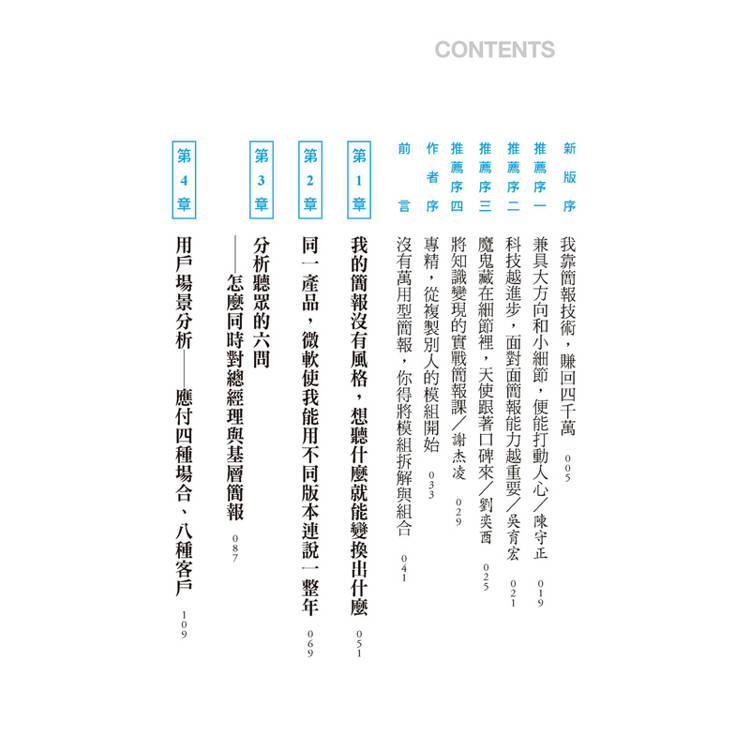 我和作者認識多年,他在工作上總是全力以赴,過去和他共事時,經常看到他東奔西走的身影,因為他在每場客戶簡報前,都用心蒐集、整理產品或服務的相關資料,致力於將完整的資訊呈現在客戶面前。這次,他把在高科技製造和資訊業服務18年累積的豐富經驗,濃縮整理成這本書,並依照想要強調的簡報重點分成11章。