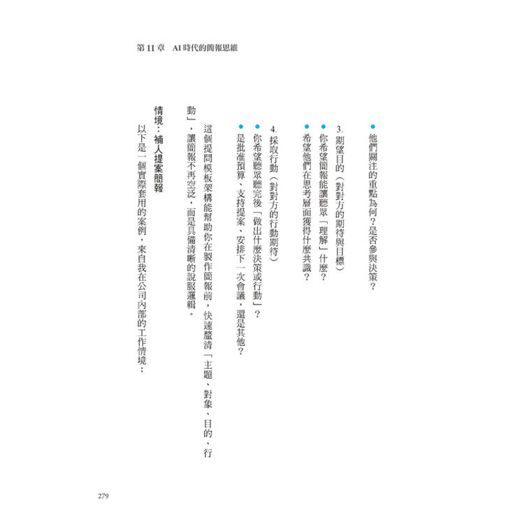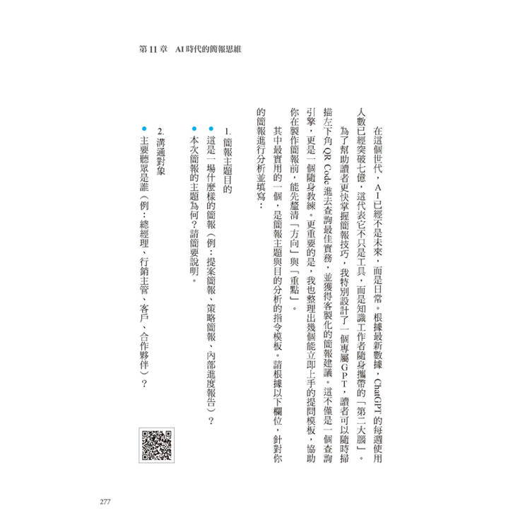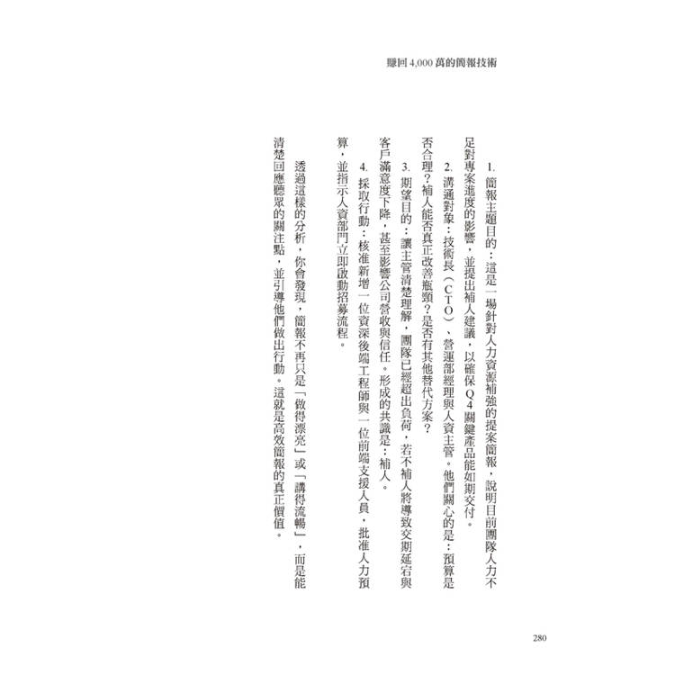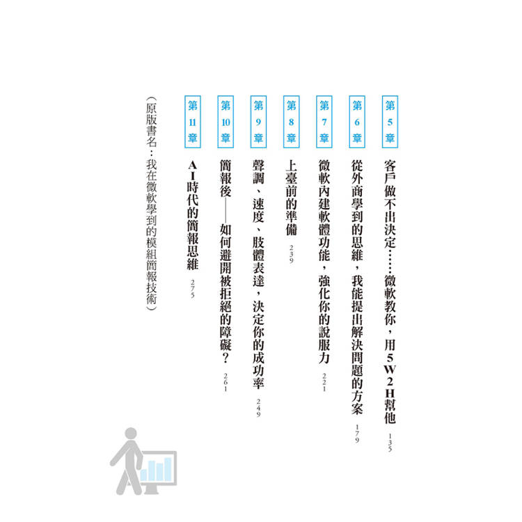 本書從簡報的結構安排,到如何站在溝通對象的角度思考,都有詳細的解說,兼具大方向和小細節的說明。
