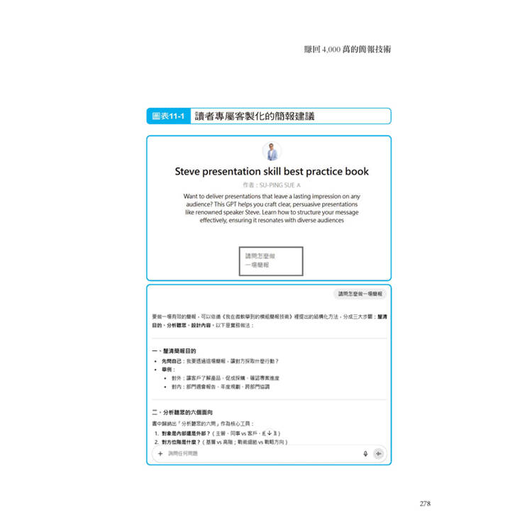 為了幫助讀者更快掌握簡報技巧,我特別設計了一個專屬GPT(https://chatgpt.com/g/g-X6UDqTK8d-steve-presentation-skill-best-practice-book),讀者可以隨時進去查詢最佳實務,並獲得客製化的簡報建議。這不僅是一個查詢引擎,更是一個隨身教練。更重要的是,我也整理出幾個能立即上手的提問模板,協助你在製作簡報前,能先釐清「方向」與「重點」。