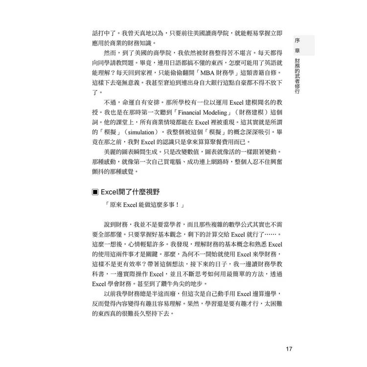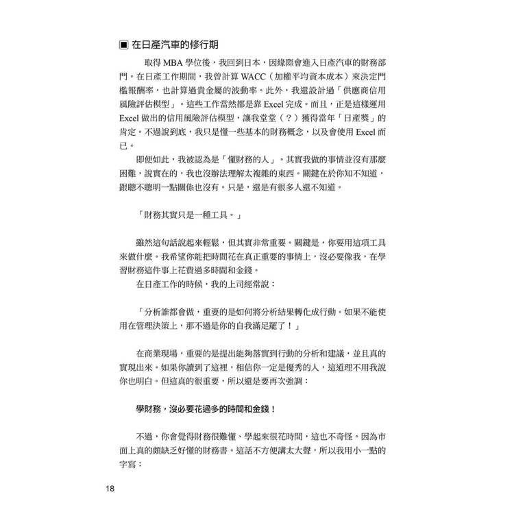 作者曾任職於三菱銀行,累積十年金融實務經驗,以及日產汽車資金風險實戰磨練,擁有美國印第安納大學凱利商學院MBA學位。本書摒除繁瑣的理論和數學侷限,利用EXCEL建模提供下載操作,藉由深入淺出的解說引導,愉快學會最具實戰價值、可立即應用於職場、投資規劃的財務能力。
