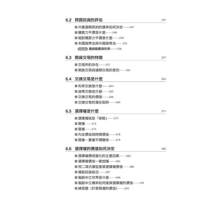 衍生性金融商品——期貨、交換(swap)、選擇權等・買權與賣權的價格關係・跨國投資的匯率問題・選擇權的價值計算。