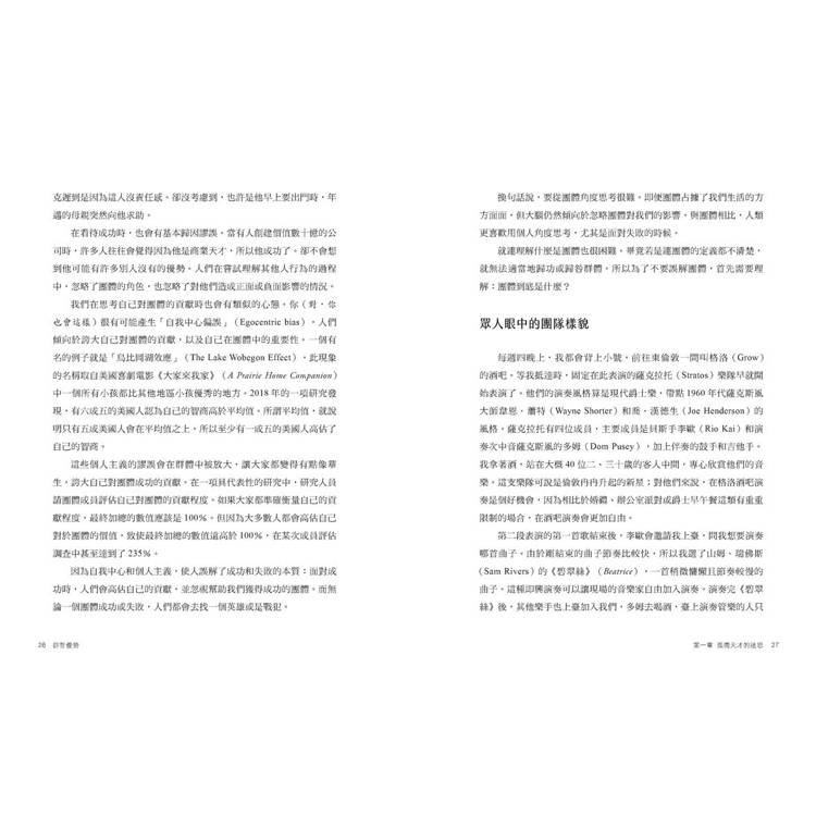 書中有四大部分,每部分中有三至四章。第一部分講的是「合作」,我會在其中解釋團體的本質,以及我們能夠如何獲得團體生活中最重要的好處:追求個人無法達成的共同目標。接著,會重點探討團體思維所帶來的另外兩個重要結果,分別是第二部分所講的「從眾」和第三部分所講的「競爭」。從古至今,我們已經看到從眾和競爭會帶來危險的後果,但我們其實也能從中獲得出人意料的好處。我會解釋能如何透過科學研究的成果,來應對團體生活中的矛盾,並打造出更好的團體。最後,我會在第四部分探討如何「領導團隊,重新定義什麼才是領導力,不再將領導力視為單獨一個英雄或反派的責任,而是像團隊運動一樣,所有人各司其職,提升並維持團體的基礎結構。我也會提供能更加瞭解「團體思想」的錦囊妙計,教大家如何實際應用領導團隊部分中提到的原則,我希望能幫助大家更好地應用學界的發現。
