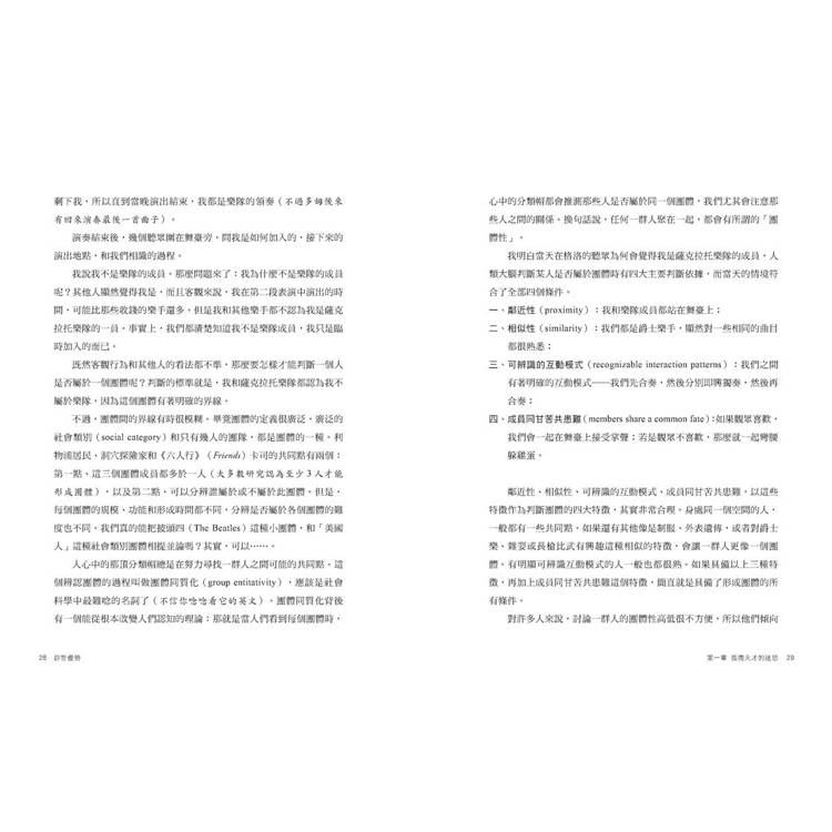 本書會觸及許多不同領域,整理並總結數十年來的上百個研究。如此一來就能以宏觀的角度去看待團體動力學,並用新的角度去看待今日的社交世界。我覺得以這種新角度思考就像戴上一副紅外線夜視鏡,揭露人們平常用肉眼看不到的東西。