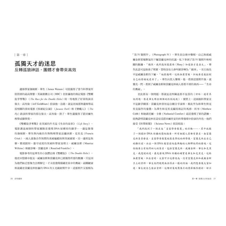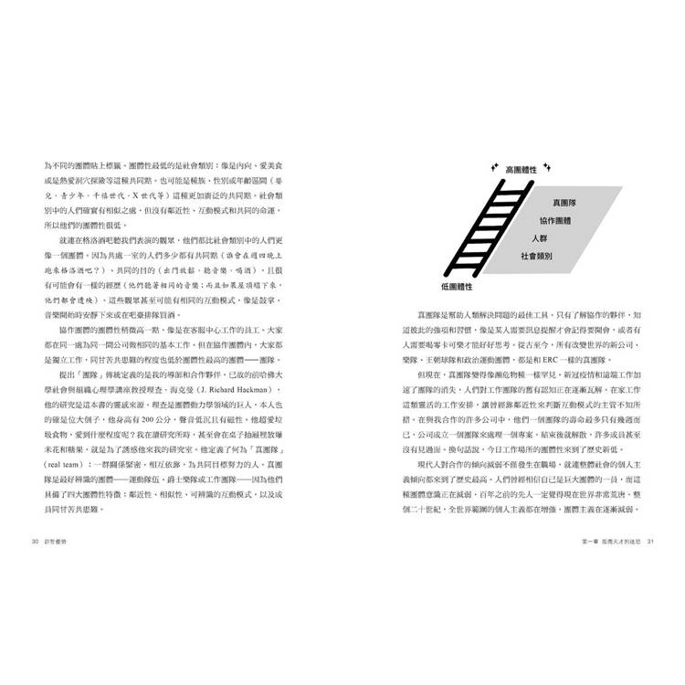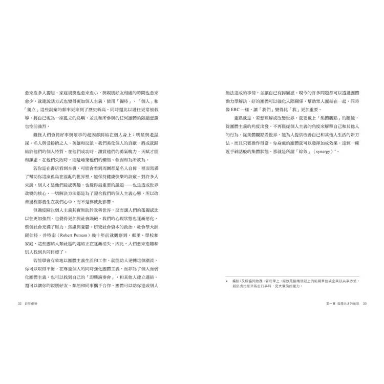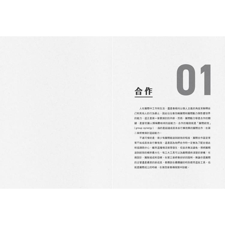 我們需要更好的團體,也就是能夠解決問題,而非創造問題的團體。是時候跳脫個人主義至上與將團體視為必要之惡的思考模式了。是時候以不同的角度來探討團體,看看團體長久以來被人們忽視的巨大潛力。只要有適當的條件,這些潛力就能轉化為成功。無論你是想要改變自己、改變工作團體還是改變世界,都需要學會運用團體動力學的力量,而不是傻傻地被這股力量左右。