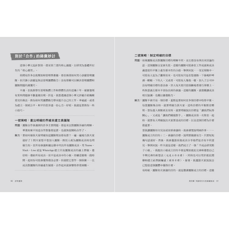 本書特別強調:合作、從眾與競爭都不是單純的好或壞,而是「雙刃劍」。合作能創造綜效,但若缺乏清楚分工,便會淪為責任互踢;從眾能維持秩序,但若壓抑異議,便會導致群體迷思與錯誤決策;競爭能激發潛能,但若設計成零和局面,則只會造成內耗與排斥。作者透過經典實驗、歷史案例與企業實務,層層解析這些現象,讓管理者不再被表象迷惑,而能理解背後的規律。